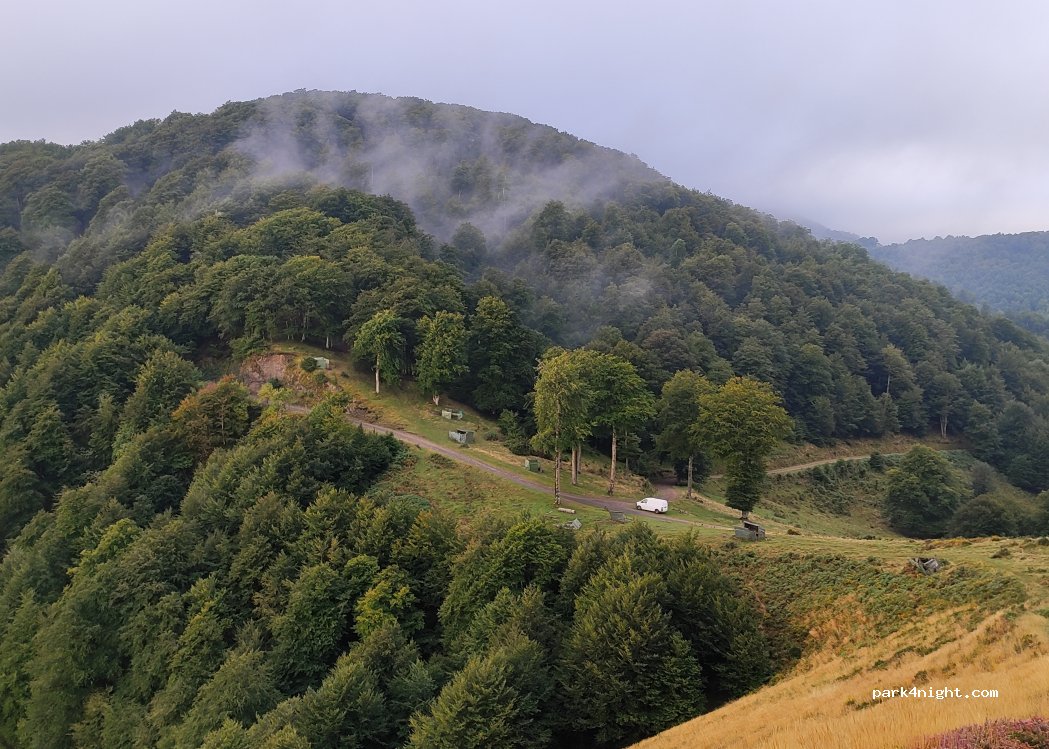 Pour van ou petit campeur. Joli point de vue très calme et en pleine nature. Chemin caillouteux et pentu. Attention si pluie. On a vu des camionnettes l’emprunter. Terrain plat pour dormir. Il faut être en totale autonomie pas de point d’eau. Pas de visite désagréable. Quelques passages le matin vers 09h/09h30 de chasseurs et randonneurs qui nous ont salué très gentiment. Entouré de nuage nous reviendrons pour la vue qui été bouchée.