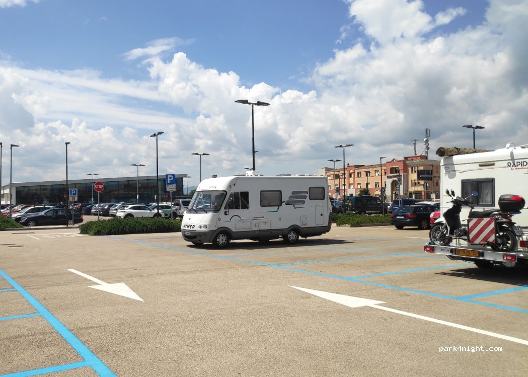 Großer und bequemer Parkplatz im Einkaufszentrum. In der Umgebung gibt es einen Lidl-Supermarkt, Decathlon und eine Cafeteria. Parkplatz für 24h bei 1€/Std. Sehr sicher! Carabinieri direkt gegenüber:-)