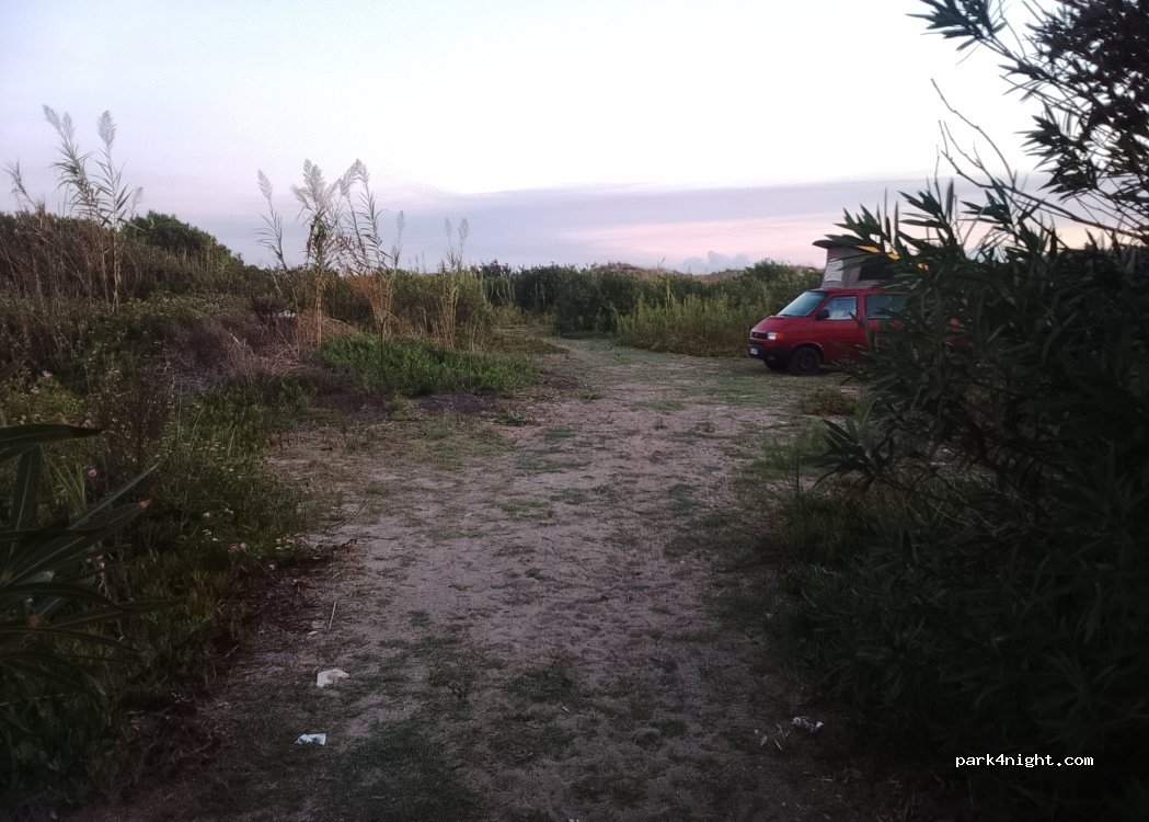 Place de parking très calme, joliment protégée des regards et envahie de roseaux et de buissons fleuris. A environ 30m de la plage naturelle (un bel escalier en bois mène par la dune à la plage, où se trouve une réserve naturelle d'oiseaux), le bruit de la mer pendant que vous vous endormez. Étaient-ils absolument seuls la nuit ? Pas de bruit de la rue, pas d'éclairage artificiel - paix totale. Nous avons déblayé une partie des déchets qui traînaient. Aucun panneau d'interdiction. L'allée est un peu étroite car il y a des buissons de fleurs des deux côtés. Ok avec un camping-car de 6m. Entièrement garé par les visiteurs de la plage locale pendant la journée.