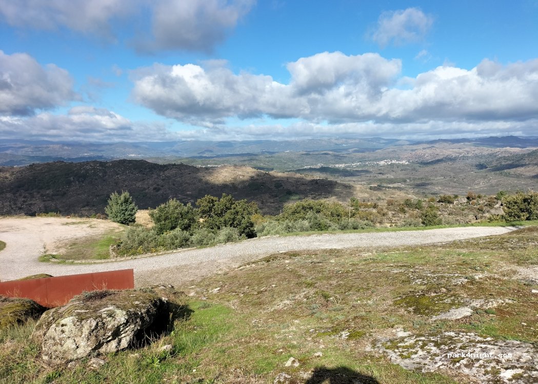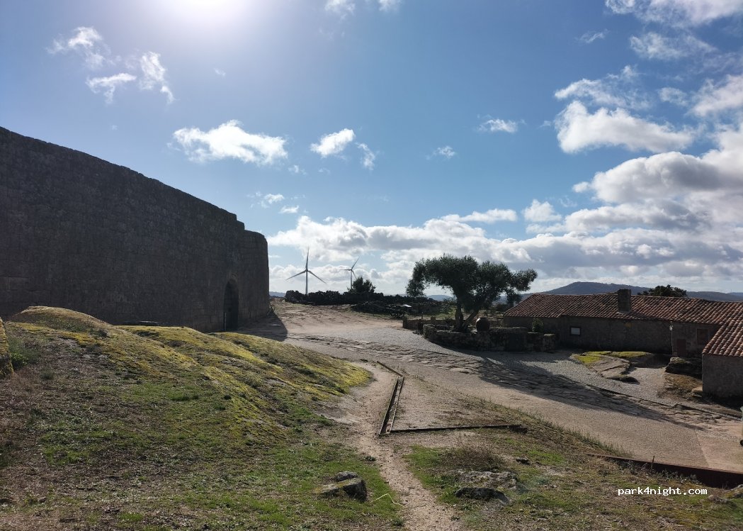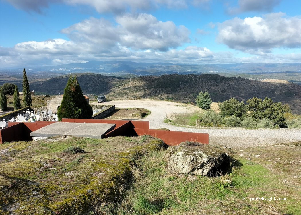 Next to the cemetery, a large sunny space with a magnificent view. Quiet area and very close to the castle and the town. The road to get there may look rough as you go but it is paved and smooth. We have a 6.36mt and we had no problems. We only spent a few hours there.