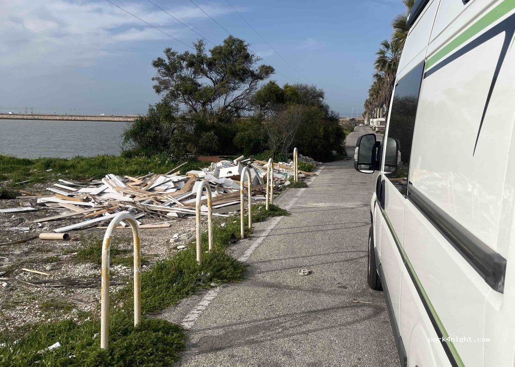 Verwaarloosde boulevard langs de zee met veel zwerfvuil. Kunnen wel 20 campers staan omdat de weg doodloopt en het parkeervakken in de lengte zijn. Staan geen autos verder, geen jongelui gezien vannacht, wel mannenliefde, dus als je alleen staan niet erg vindt een prima plek. Helemaal met de hond.