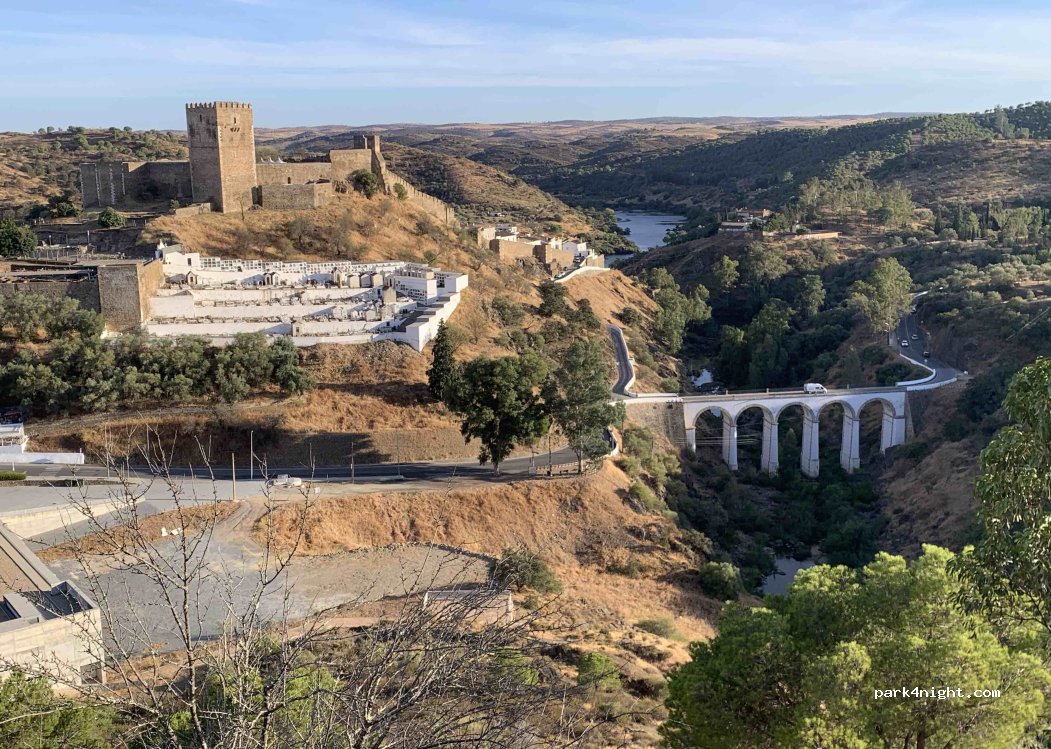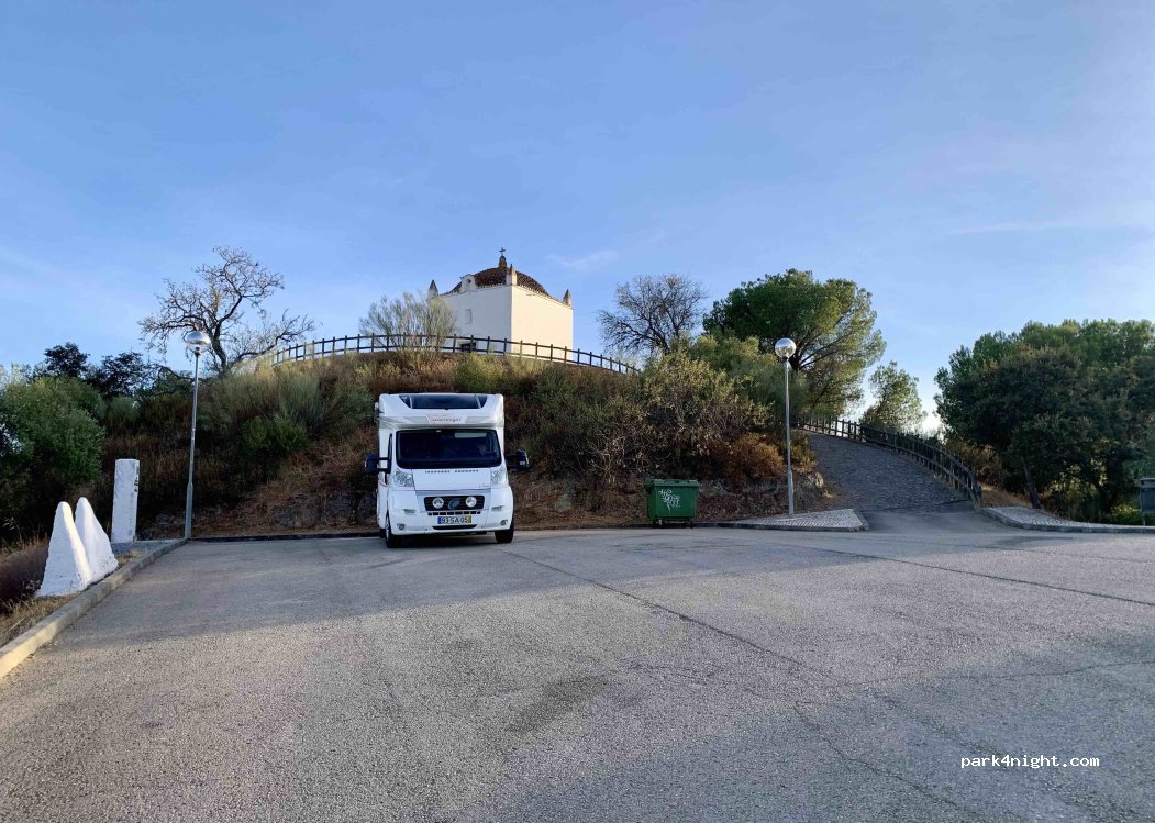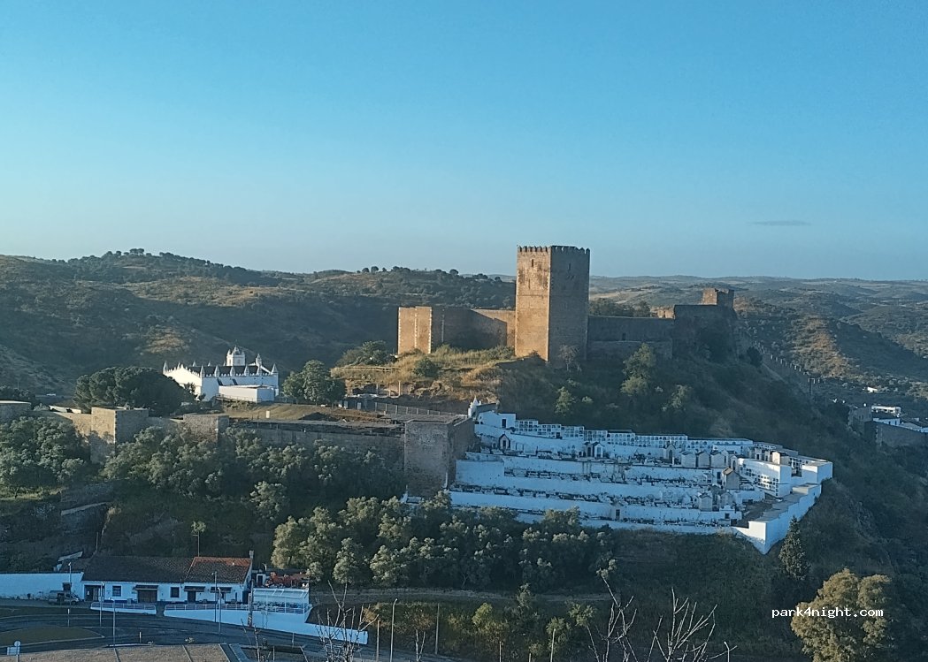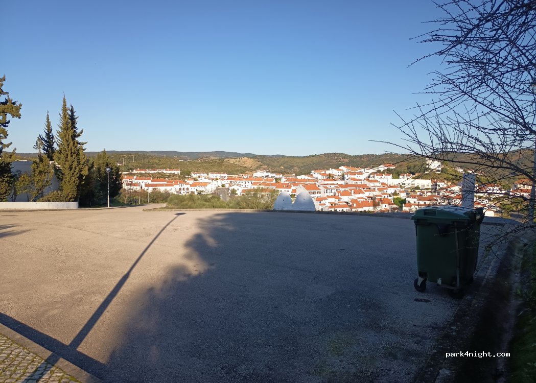 Small asphalted P on top of hermitage “Neves” hill, also used for cemetery access, providing excellent panorama over MÉRTOLA historic hill with castle and walls, Guadiana river, remaining white residential blocks. Good to watch sunset and rising. NOTE: to overnight, move to gravel flat area at left of cemetery, as GNR police does not allow here.