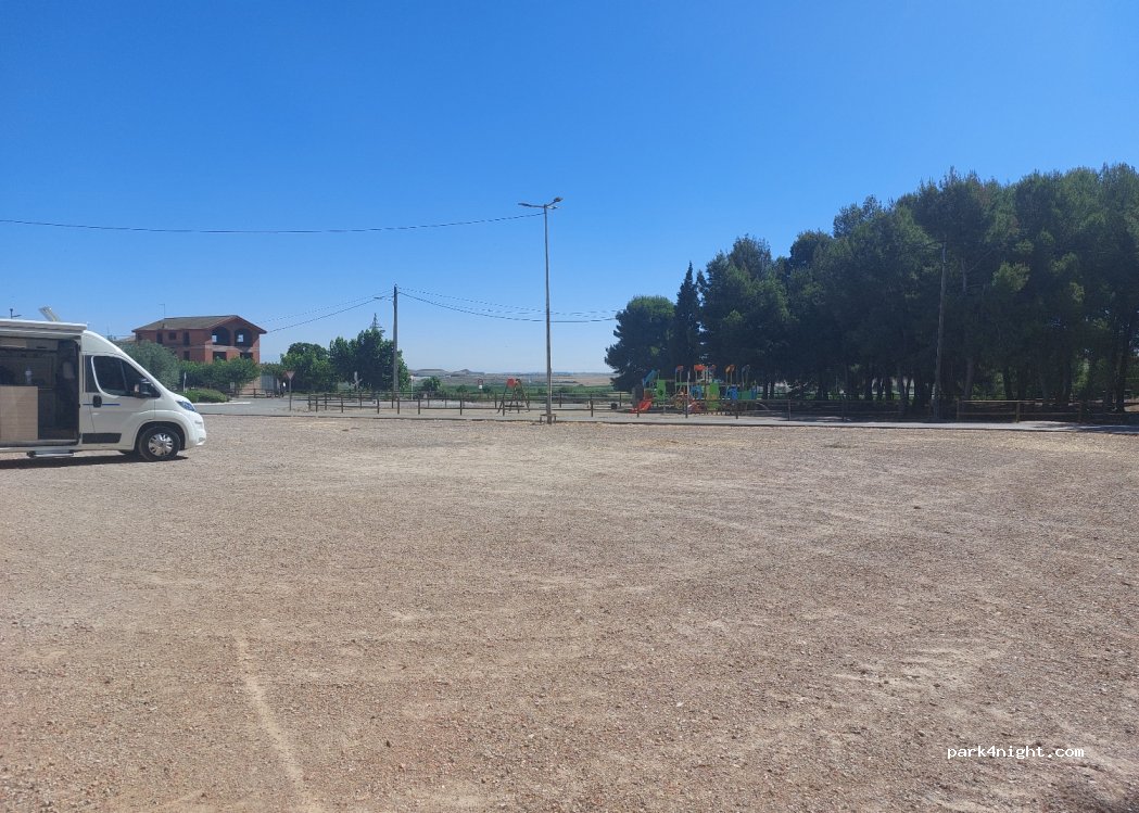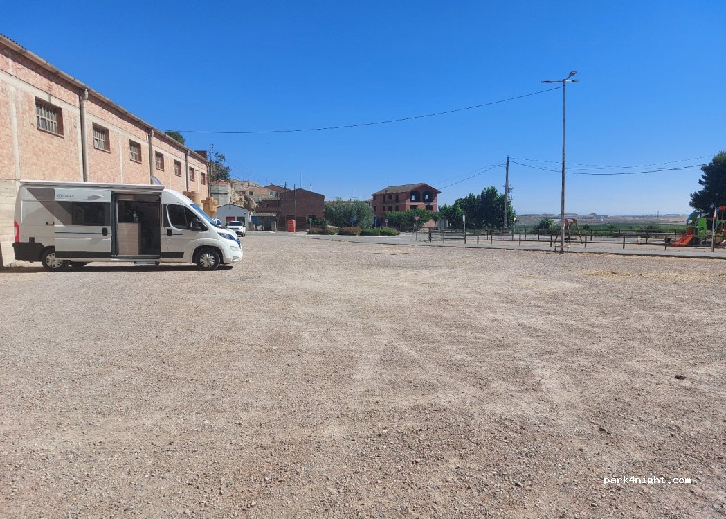 Gran descampado de tierra muy plano, a la entrada d un pueblo muy tranquilo. unos 3 km desde la nacional, buena opción de parada en ruta antes o después de Lérida. sitio muy tranquilo y silencioso. hay un parque infantil enfrente y una zona arbolada con bar y piscina al lado. Hay otro gran descampado entre la zona arbolada y el edificio, calle sin salida incluso más tranquila.