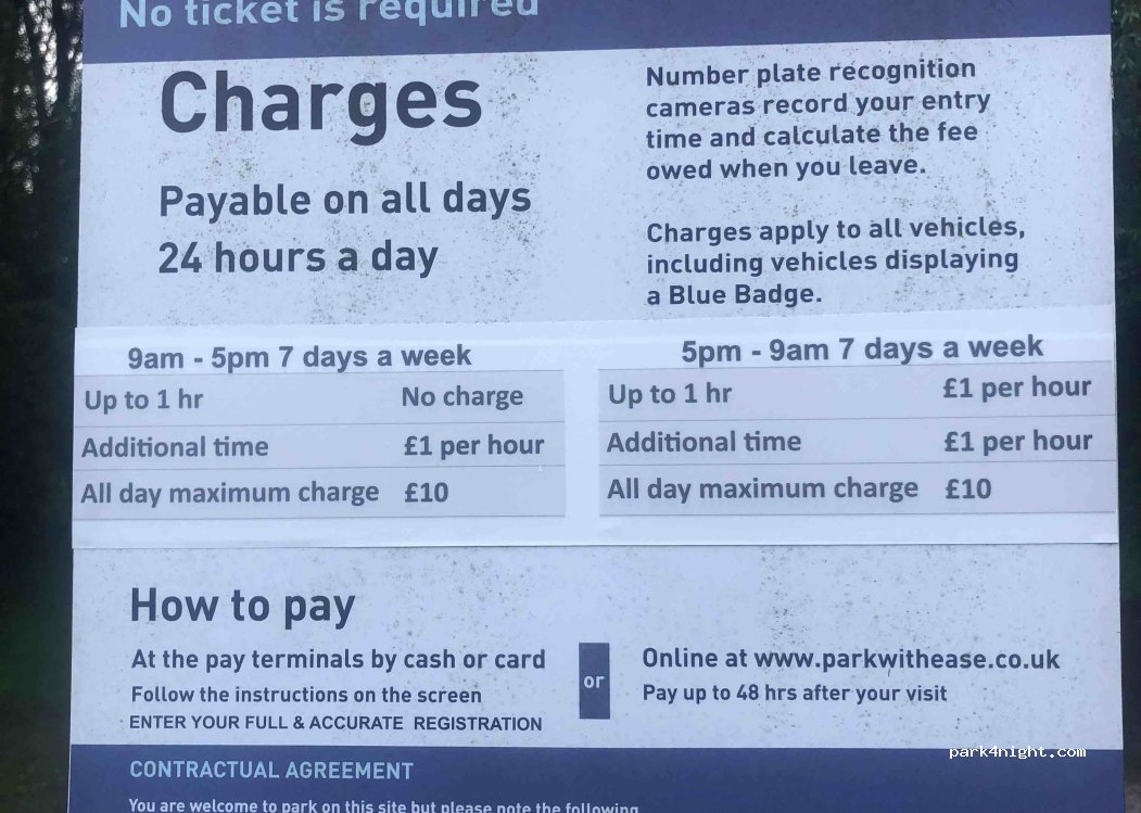 Stayed overnight on car park and it's exactly that, it's grand. Prior departure, enter your registration in the touch screen and you pay via card at the machine or log on to the website. First hour - no charge. Up to 2 hours, 50p, with each additional hour being 50p but there's a maximum £5 per 24 hour (not calendar day). e.g. I parked up at 5pm and departed prior to 5pm the next day = £5.00
