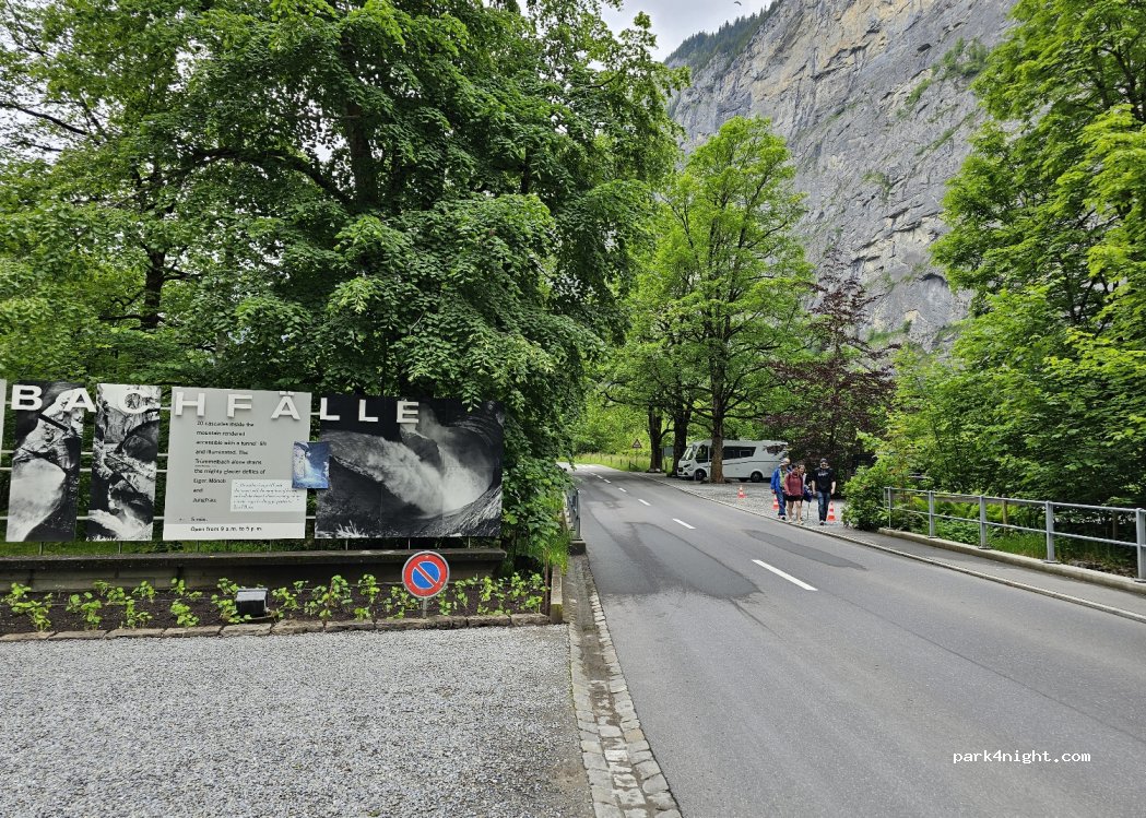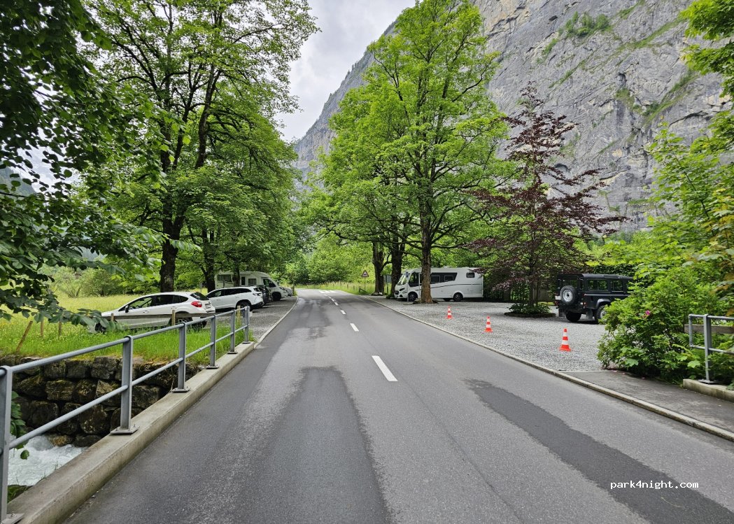 parking ONLY if you are going up the Trummelbach Falls otherwise you will be told to move on. Go past the entrance to the falls and then you will find a few parks on the right and left of the road. There are signs showing a motorhome and a red line thru, but that is only for camping overnight. The owner keeps a close eye on things. The Trummelbach Falls are a must to see and a nice cafe there.