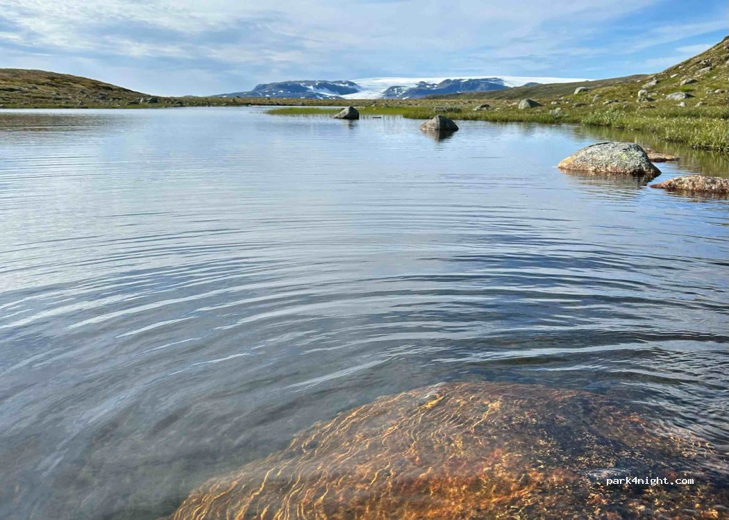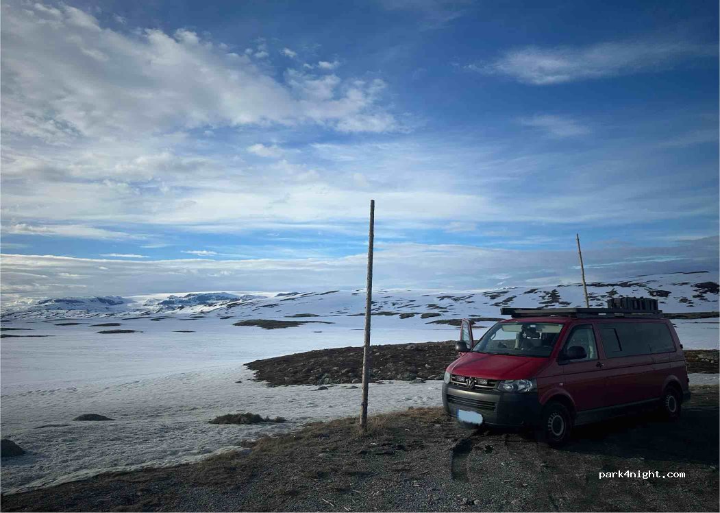 Traumhaft schöner Ort. Mit Blick auf den Hardangerjøkul(Gletscher) Ein paar LKW fahren vorbei, stört aber nicht wirklich. Zu dem Stellplatz etwas abseits kamen wir aufgrund von Schnee nicht. Nehmt euren Müll mit!