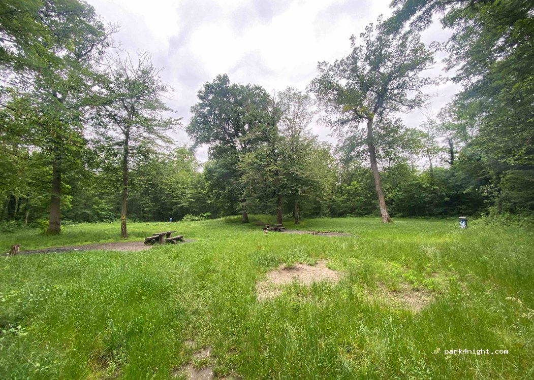 Forest parking at a barbecue area. Quiet location. Frequented by joggers, walkers and dog owners. A warning sign indicates that valuables may be stolen from the car. Gravel subsoil, mostly flat. More suitable for vehicles with a length of up to 550cm. Several rubbish bins, barbecue areas and wooden benches with tables on the barbecue area.