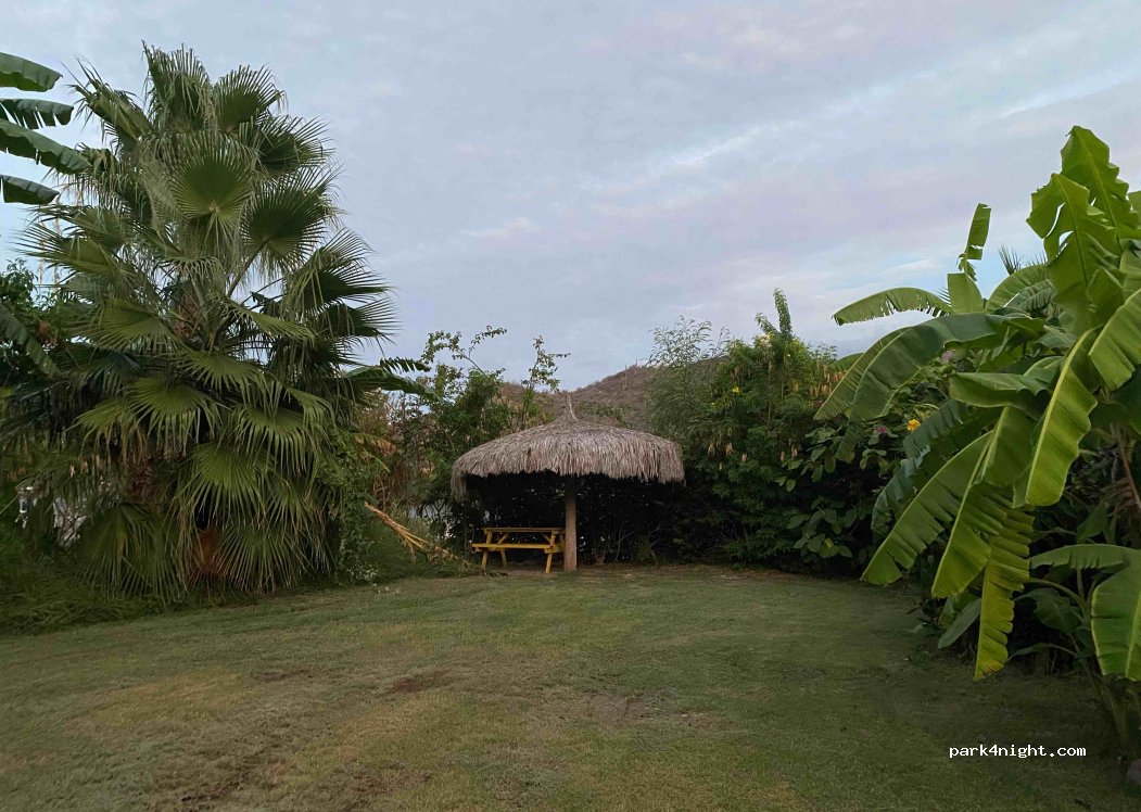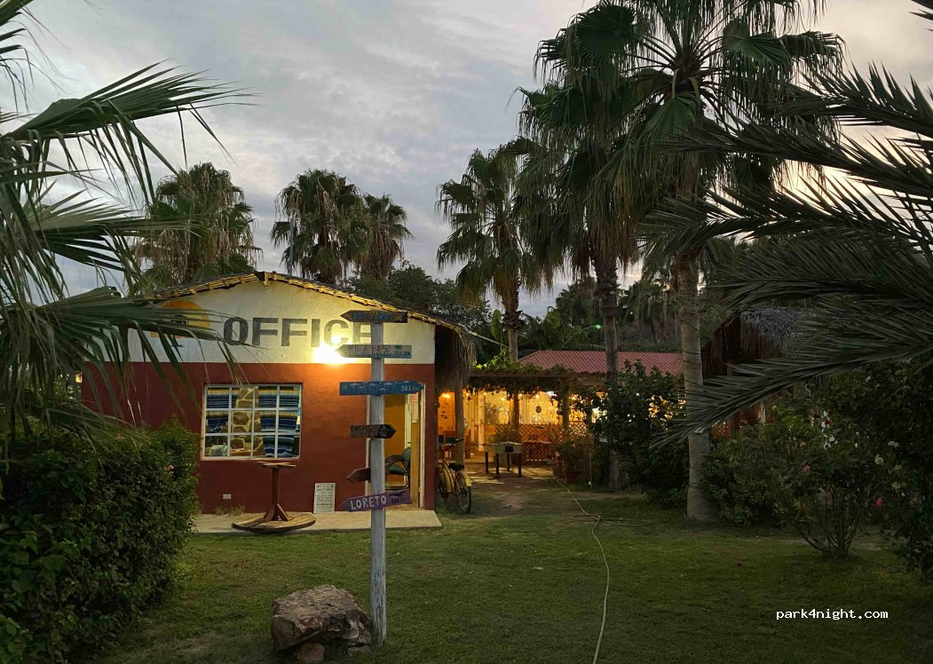 Bonito camping en las afueras de Mulegé. Hay piscina, las parcelas están muy bien ajardinadas con palmeras, plataneras, etc. y puedes recoger mangos de los muchos árboles de mango. También hay un restaurante al lado. Los precios de las canchas son muy razonables. Hay una antigua misión en el pueblo con una linda vista y las playas de Bahía Concepción no están lejos.