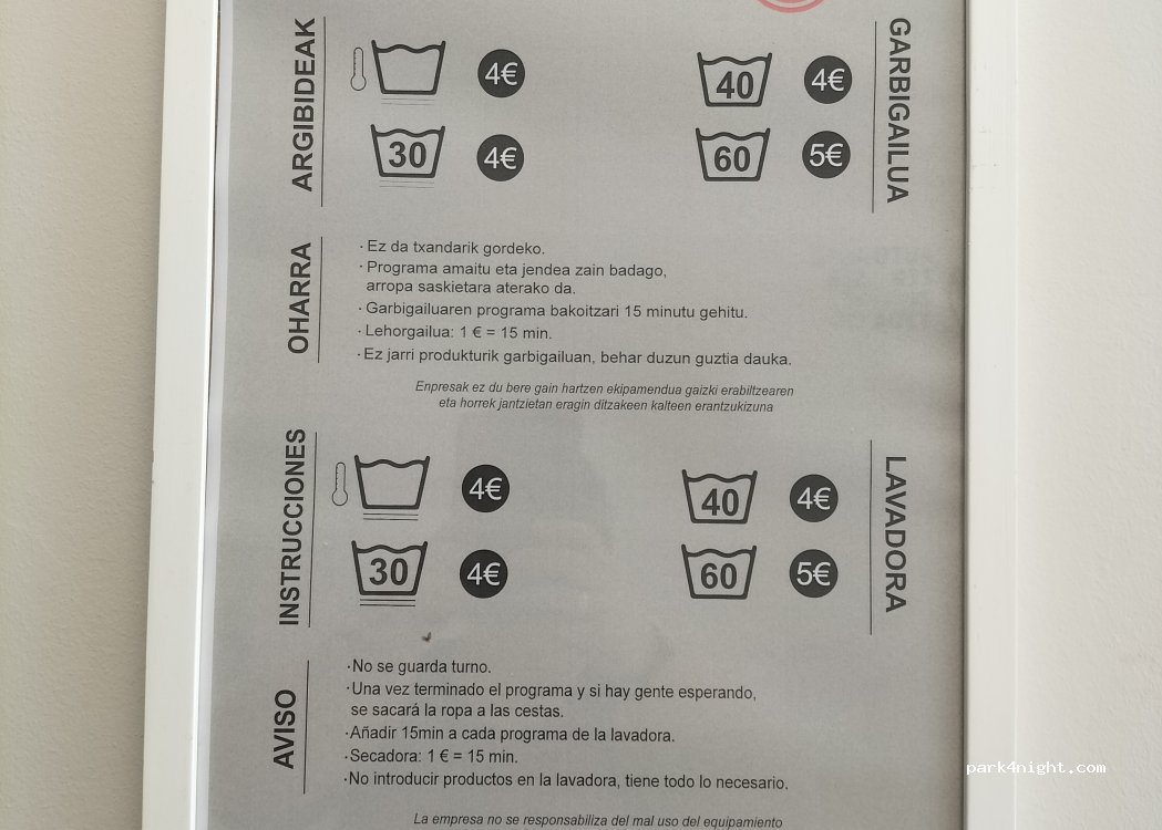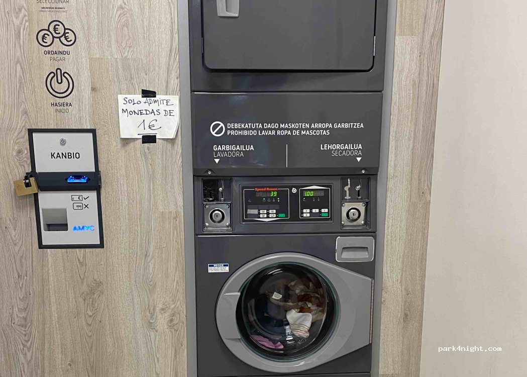No tuvimos problemas de parking AC, tiene 2 lavadoras de 10kg a 4 € lavado que dura 40m + 2 secadoras por 1€. máquina de cambio y solo acepta monedas de 1€. Las secadoras por 15minutos sea la temperatura que le pongas no seca bien . hasta 3 veces la tuve que poner y nada sale húmeda. El par que está ala lado muy bien de comida tanto carta como menú de 20€ , vale la pena. Servicio espectacular.