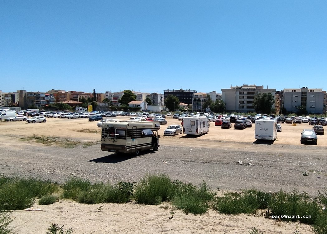 Grand parking en terre battu. Plutôt désert et dans quartier peu rassurant. Proche de la plage à 1km du centre de Salou.