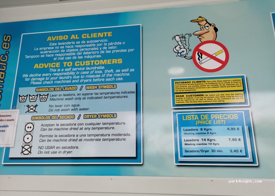 There is free water at the Campsa red station, inflating tires! right next to another station where there is the laundry and also the same services