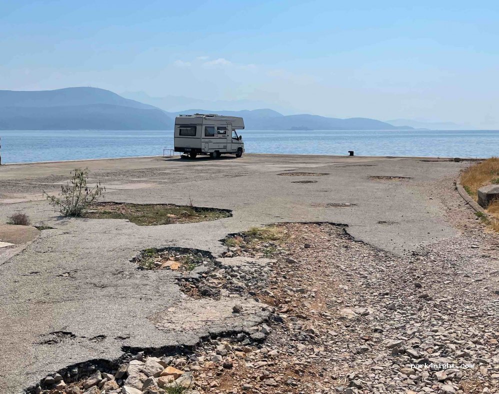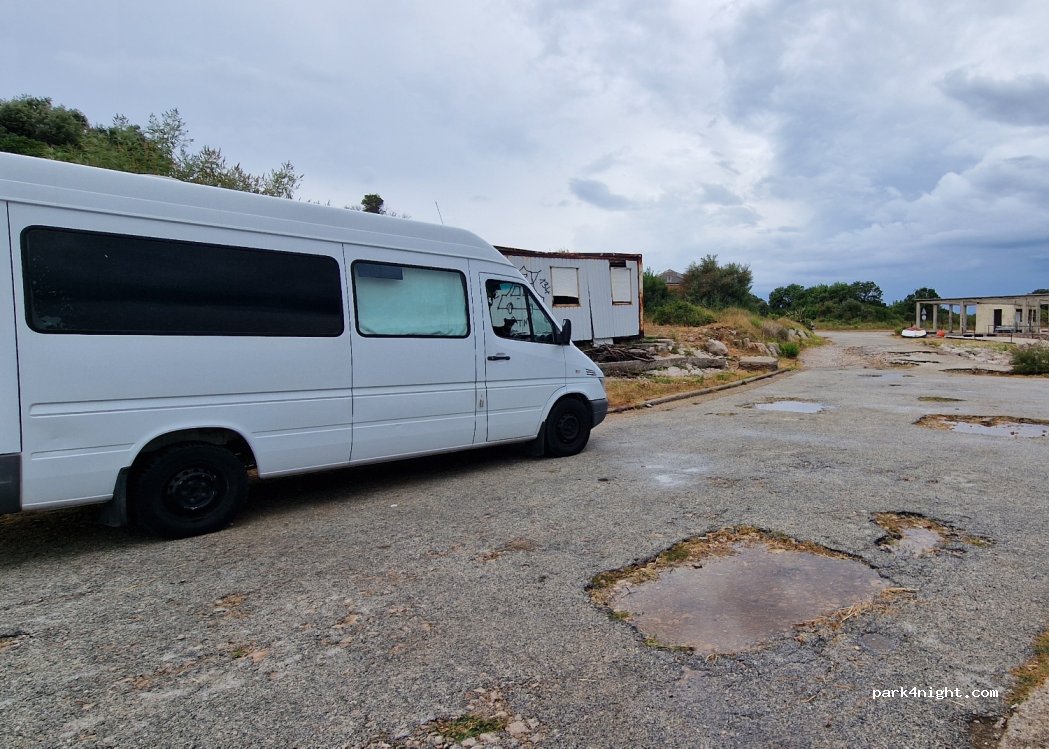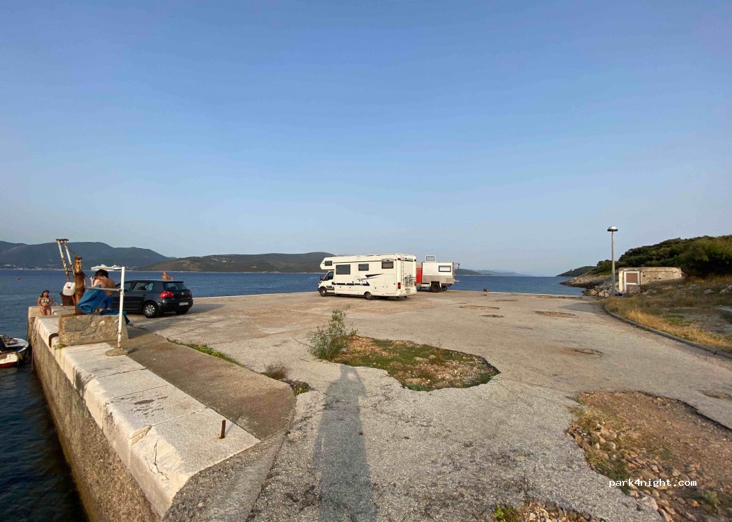 Parking spot is ex military pier. Nearby there is a restaurant with good and cheap food, as well as toilets and nice small beach. The view at night is magnificent. The locals are very friendly. Choose HT HR mobile network manually. Only left road till the end is ok for big campers. Other roads on peninsula are quite overgrown and narrow.