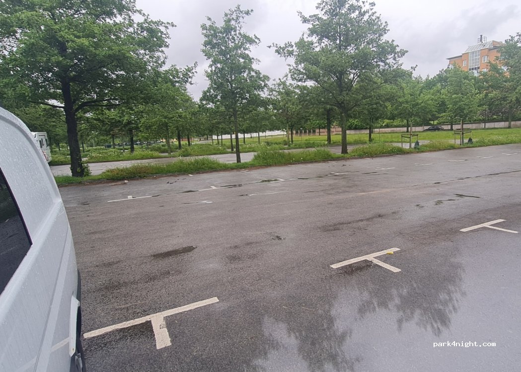 Grosser Parkplatz, ideal um mit den Fahrrädern in die City zu fahren. An unserem Tag war eine nahegelegene Reitveranstaltung, weshalb viele Leute da waren. Somit keine Sorgen vor Aufbrechen etc. Keine Möglichkeit zur Entsorgung von Toilette/Grauwasser, ebenso Auffüllen von Frischwasser. Max. Park Dauer von 4h.