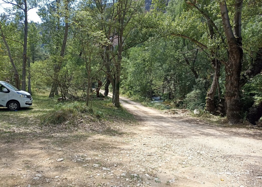 Lugar tranquilo y con sombra al lado del río. Camino de tierra pero en buen estado. De lo mejor que hemos encontrado en la zona