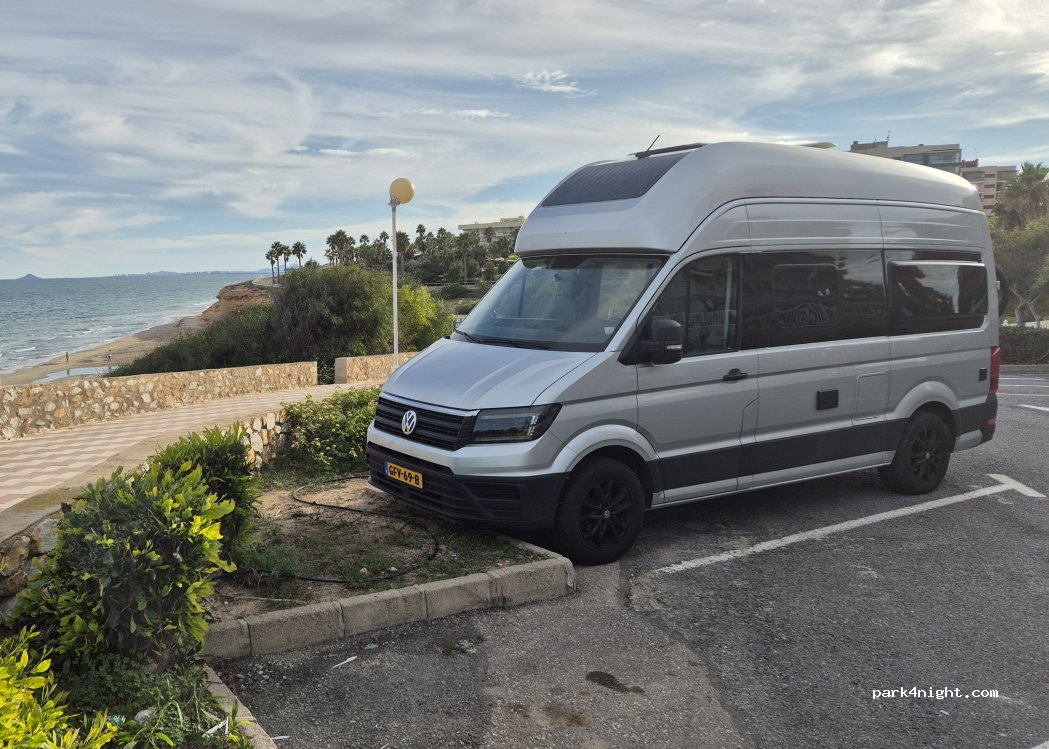 Waanzinnig uitzicht!!! Alleen de laatste plek bovenin is recht. Ik stond helemaal alleen. Vind mijn bus 5.40 eigenlijk wel maximum, pas precies in een vak. Neem geen 2 plekken overdwars aub. Containers dichtbij. Prachtig om te wandelen naar zee en pad langs zee. Gracias voor deze prachtplek. Ik ga een rondje vuil prikken als dank. Ziet er overigens netjes uit.