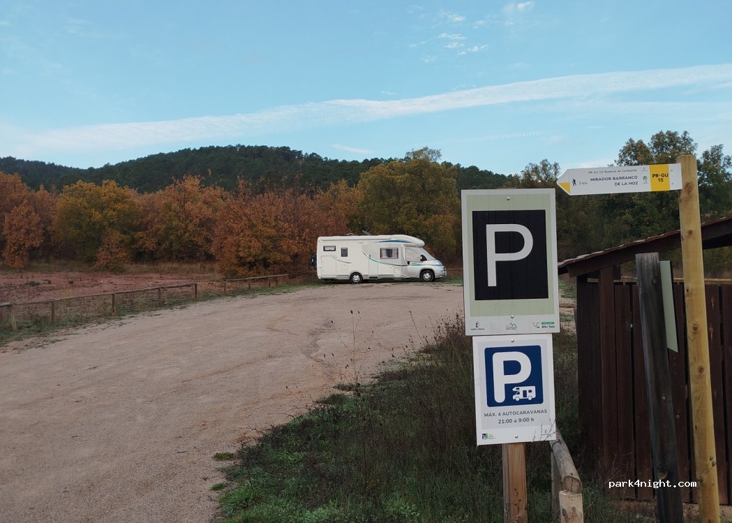 Zona de aparcamiento de la casa del parque, con zona de juegos para niños, con un manantial a 50 metros de la zona de aparcamiento (al borde de la carretera, al otro lado del centro) y mesas a la sombra...
