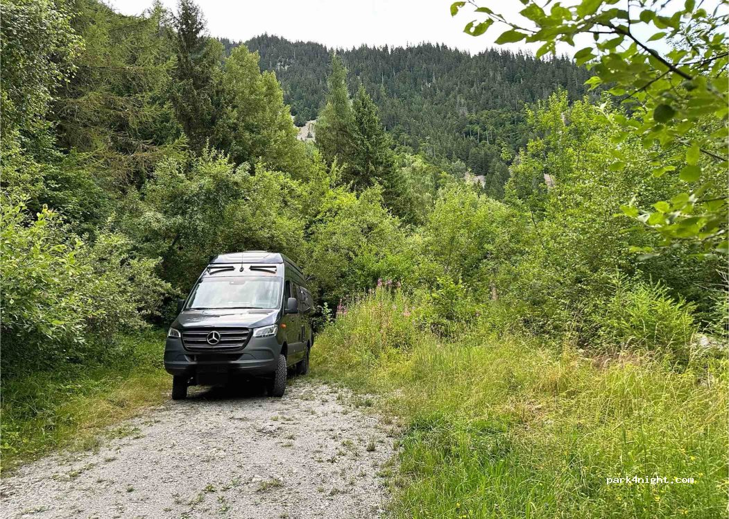 Super spot en tout-terrain, sur 100m plusieurs endroits assez plats pour s’arrêter le long du chemin. Plusieurs endroits pour faire demi-tour aussi. En s’éloignant assez on n’entend pas du tout la route. Nous y sommes allés en Sprinter 4x4 H2L2. Attention à bien laisser le passage dans le chemin car il est emprunté.