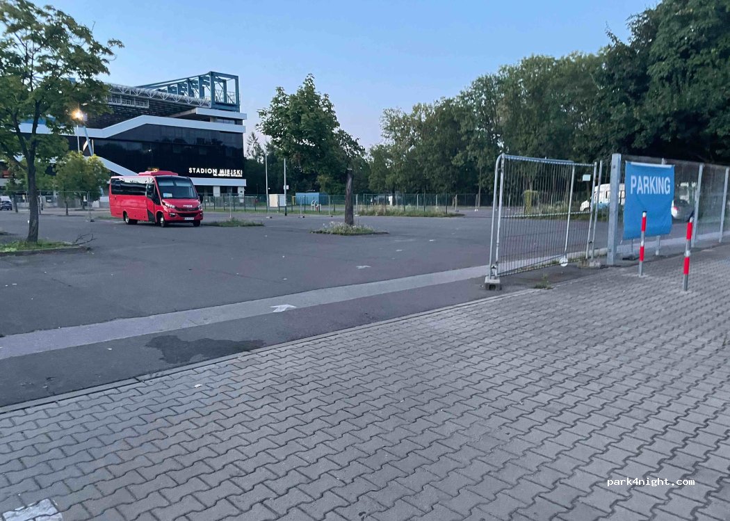 Parking de l'estadi, amb vigilant de dia i càmeres de vigilància. Ens hi hem sentit molt segurs. Localització ideal per visitar la ciutat, amb parada de tramvia davant la porta, i lavabos públics impecables a l'altre costat del carrer (2PLN). Si viatges amb nens, hi ha el millor parc de la ciutat just al costat, amb un parc gratuït de fonts d'aigua molt ben parit! El preu és de 50PLN de 8h-22h.