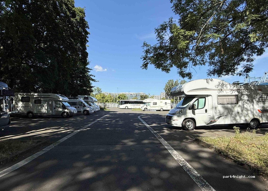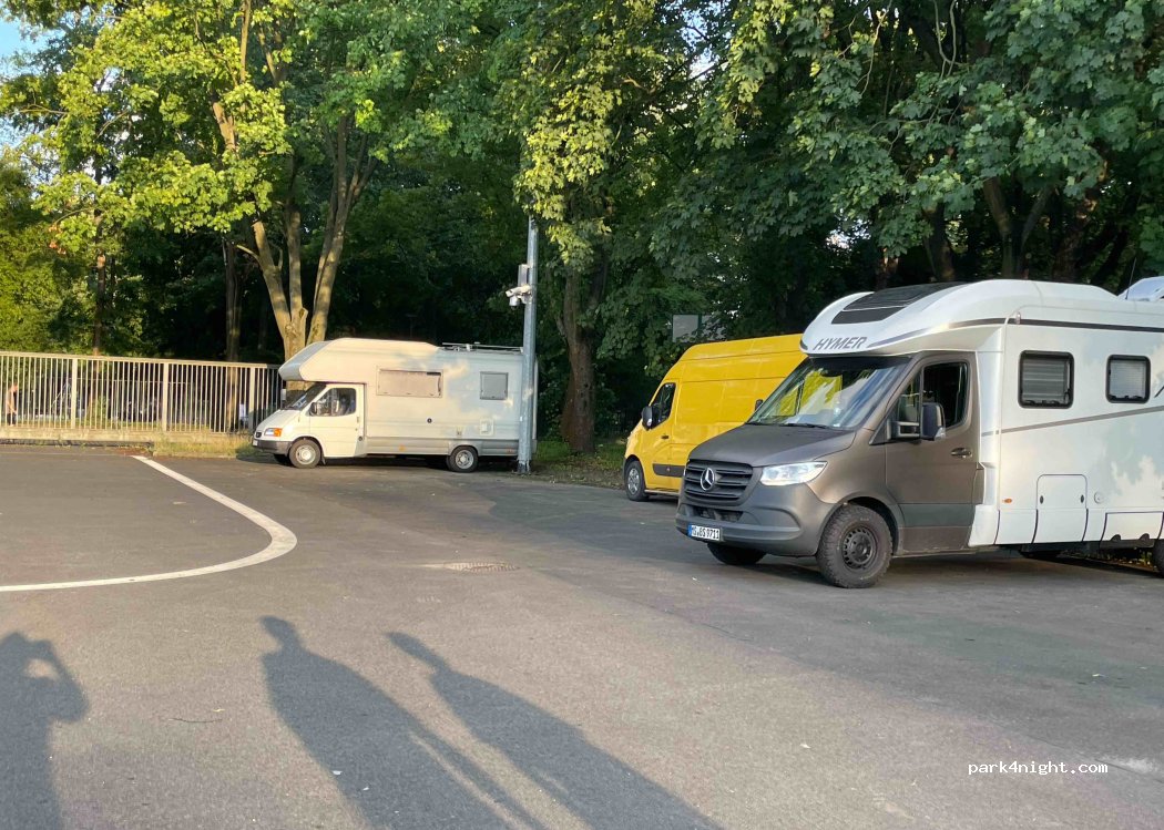 Großer bewachter Parkplatz, schattige Plätze vorhanden. Daneben großer Park mit vielen Spielgeräten und Sportplätzen. Straßenbahn direkt davor, ist praktisch aber auch laut nachts.