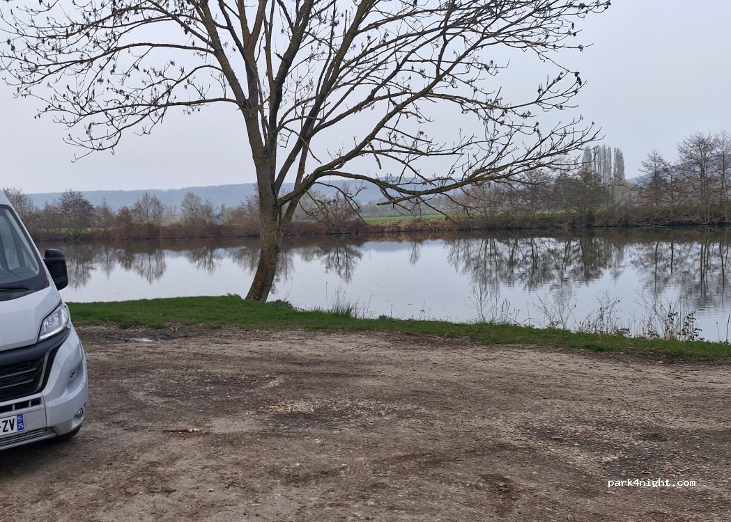 Saint-Pierre-la-Garenne. An einem Ort namens Le Goulet. Am Ufer der Seine. Neben dem Restaurant "Les Canisses" (ausgezeichnet). Warnung: Folgen Sie nicht dem GPS, das Sie zu einem Fußgängertunnel führt, an dem keine Wohnmobile vorbeifahren. Nehmen Sie die "rue de la gare", die über einen Bahnübergang führt. Aber wenn Sie die Nacht verbringen, können Sie nicht vor 6:30 Uhr abreisen. Der Bahnübergang ist manuell, immer geschlossen und öffnet nur, wenn Sie ankommen. Ab und zu fahren ein paar Züge vorbei, aber ansonsten ist es sehr ruhig.