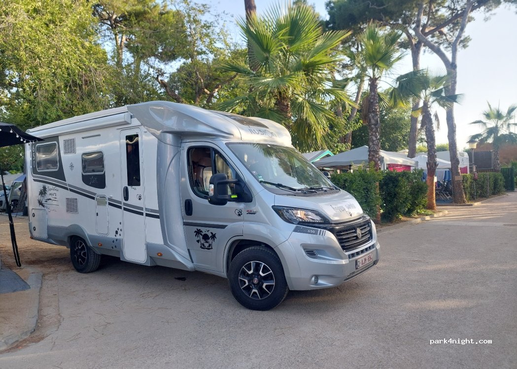 Bon camping dans l'ensemble, nous y sommes actuellement, il y a de la place sans réservation, actuellement en camping-car 7 m, le camping est un peu étroit à certains endroits pour circuler, on a réussi à se garer dans le long de l'emplacement. Pas de vidange des eaux grises possible mais eau noire oui aux sanitaires. Le camping est très propre, tout est entretenu régulièrement. Piscine très grande, ouverte de 10h à 20h. Bar à la piscine est entrée du camping. Sur l'emplacement on a rentré le camping-car, déplié le store et planté une tente de 4 m de long à côté du store. Le choix de l'emplacement est libre à l'arrivée, il y avait beaucoup de disponibilité. Très proche de la mer, une rue de 100 m à passer. Le camping possède un supermarché juste à l'entrée qui possède le nécessaire.