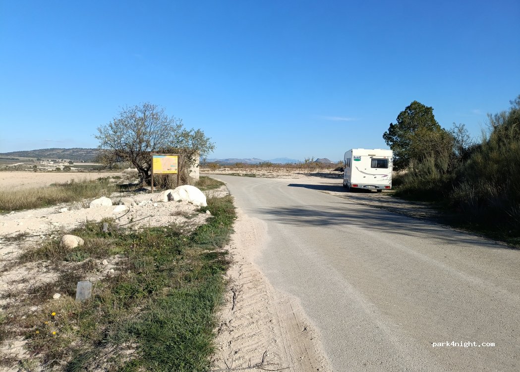Siguiendo la carretera que va de Moratalla a Calasparra encuentras aproximadamente a 1km (pequeña caseta y cartel que lo indica) un camino a la izquierda que es el inicio del sendero que va al estrecho del Bolvonegro, normalmente se aparca a orillas de la carretera y entras caminando, nos decidimos a entrar con el coche a ver si podíamos avanzar un tramo del camino y encontramos este maravilloso lugar donde pernoctar, justo en el siguiente cartel donde te explica los encantos de la ruta, al lado del puente. lugar tranquilo al lado de un arroyo.