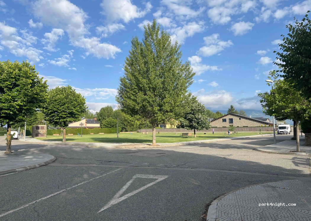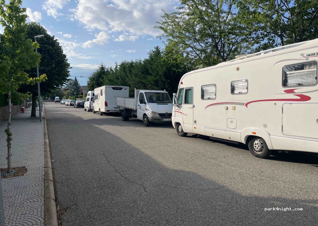 Zona tranquila para aparcar y pasar la noche, entre casas y cerca del campo de fútbol. A unos 10 andando del centro. Suelo bastante nivelado. Sin servicios.