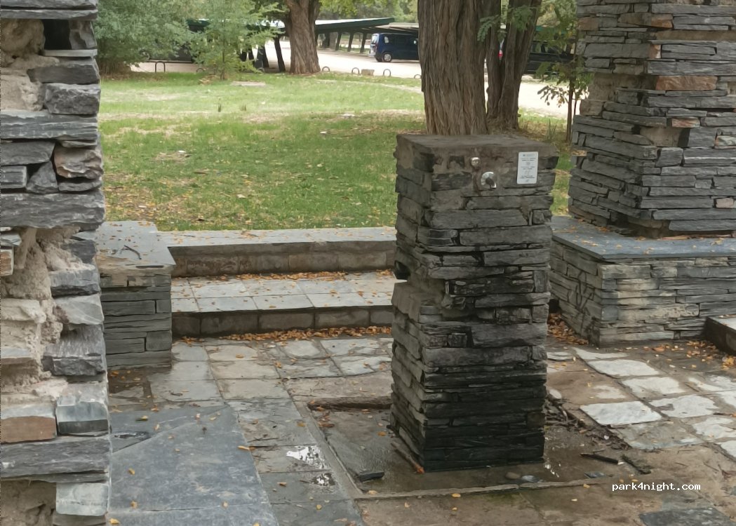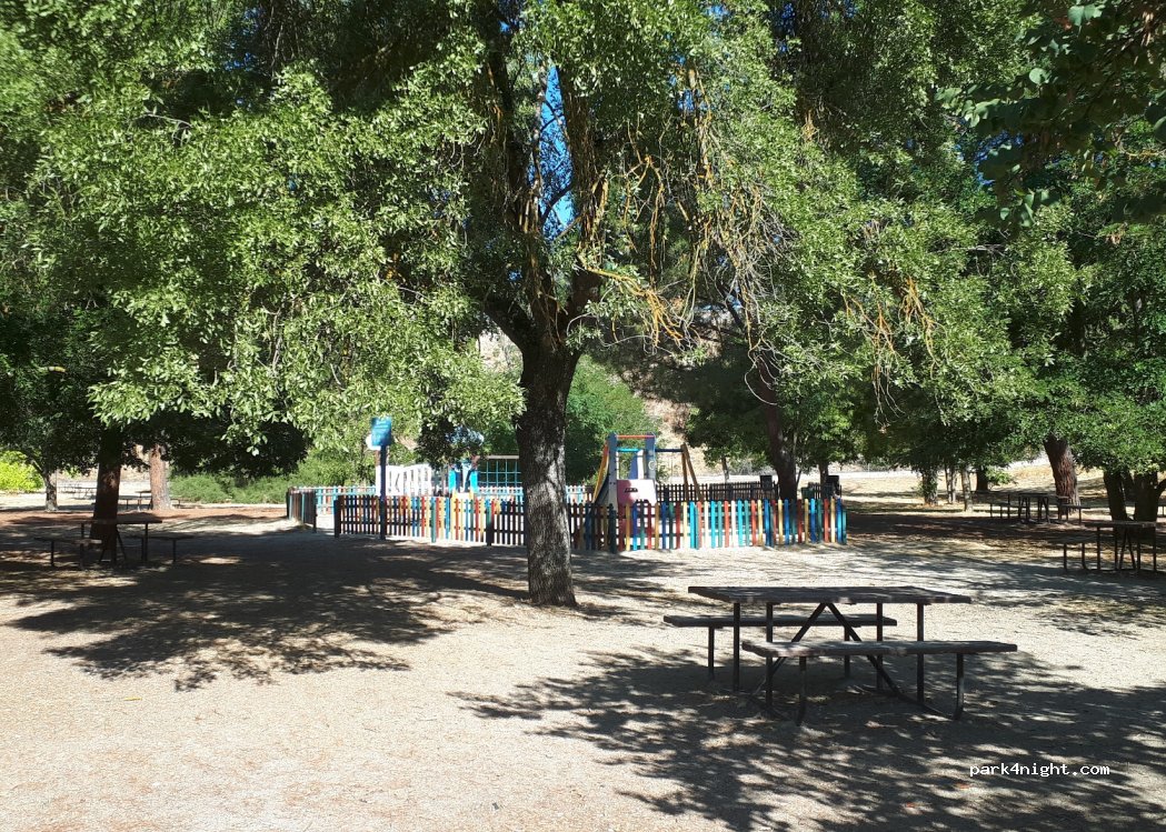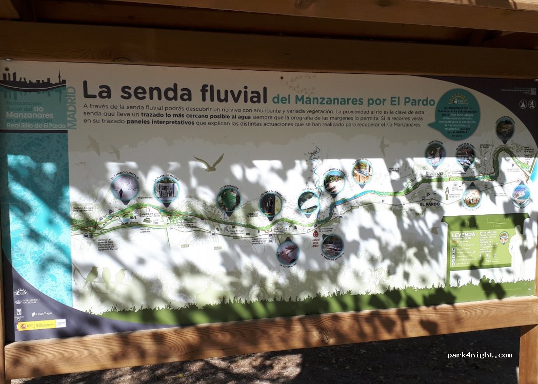 Parking on the banks of the Manzanares River. Area with covered and outdoor parking. You can go fishing and go hiking. There is a drinking fountain, tables and a children's play area past the fountain. There are also river beach areas to get your feet wet.