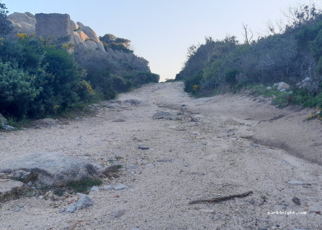 Chemin de terre, parfois difficile. vue sur la Corse et l'archipel de la Maddalena. En contrebas, la spectaculaire plage est accessible à pied ou en véhicule préparé pour le chemin de terre.