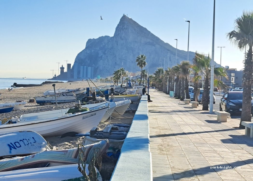 Guter Platz um Gibraltar zu Fuß zu erreichen. Für Fahrzeuge über 6 Meter eher nicht geeignet. Überall an der Promenade sind Mülleimer und Strandduschen vorhanden. Morgens ab 7 Uhr wird's unruhig, da viele Locals den Bereich als Parkplatz nutzen und von hier mit Ihren E-Scootern nach Gibraltar reinfahren