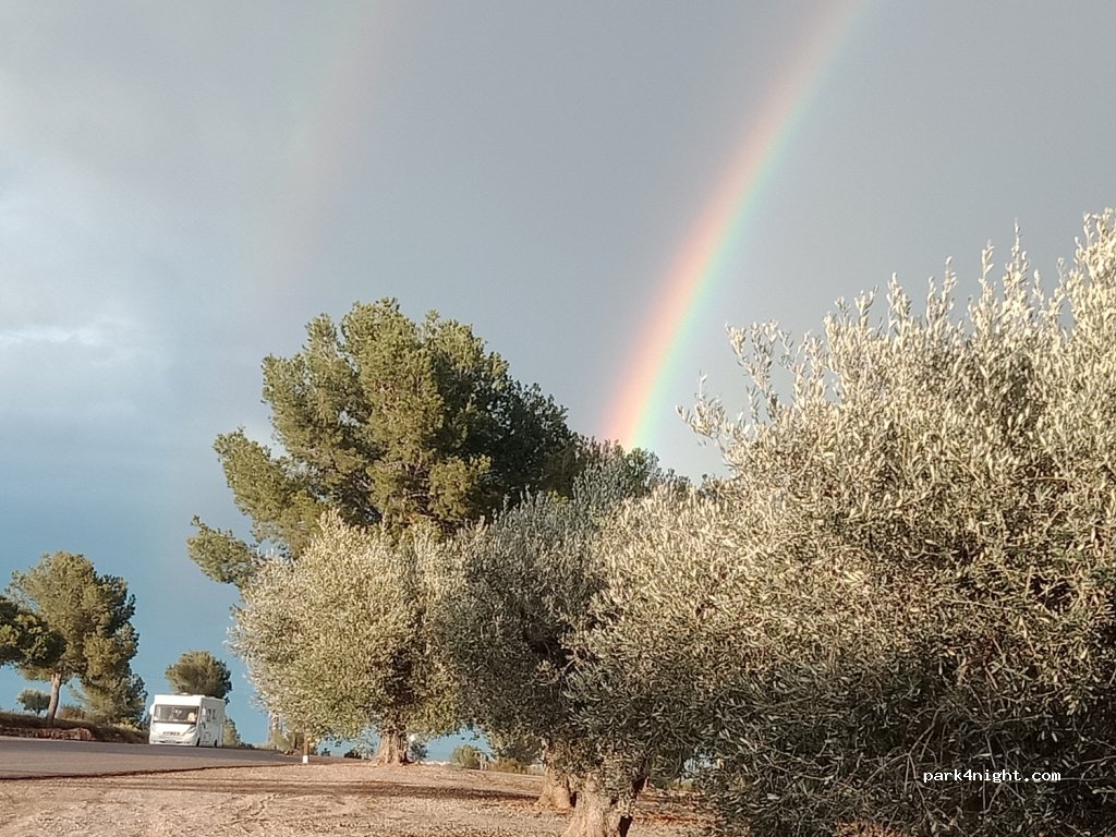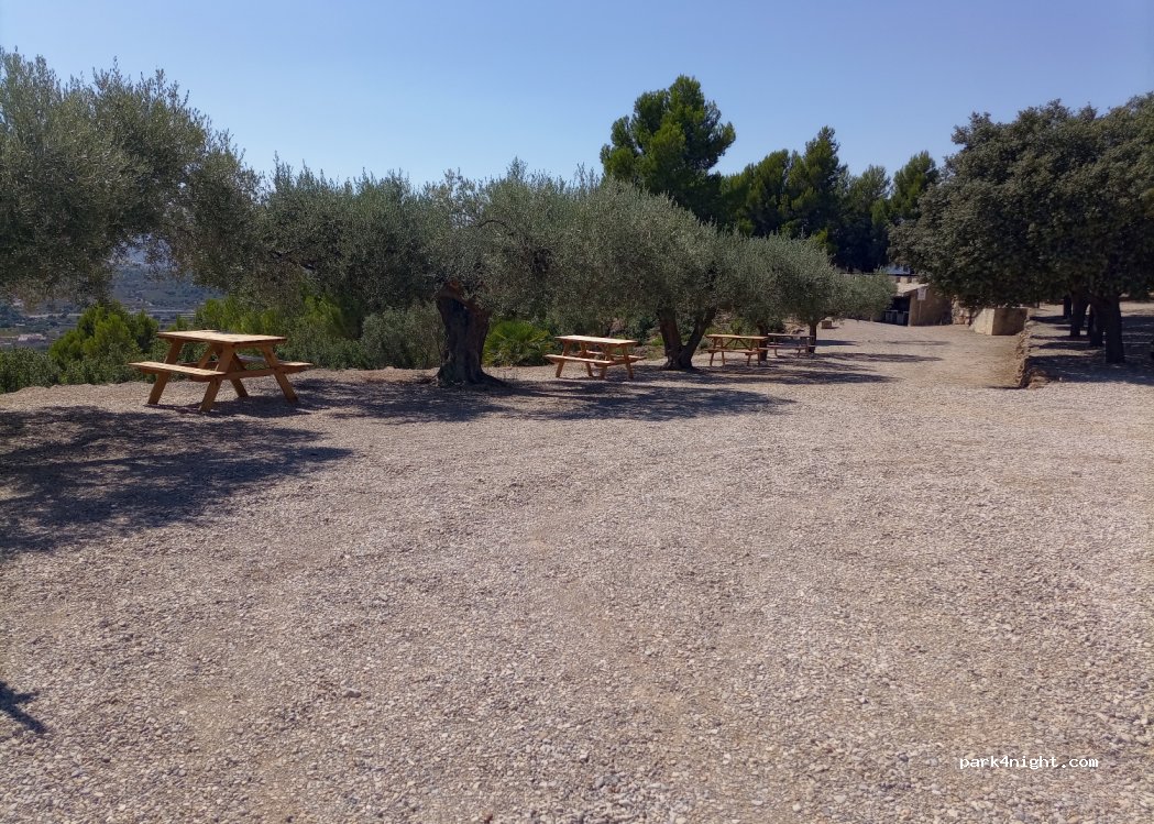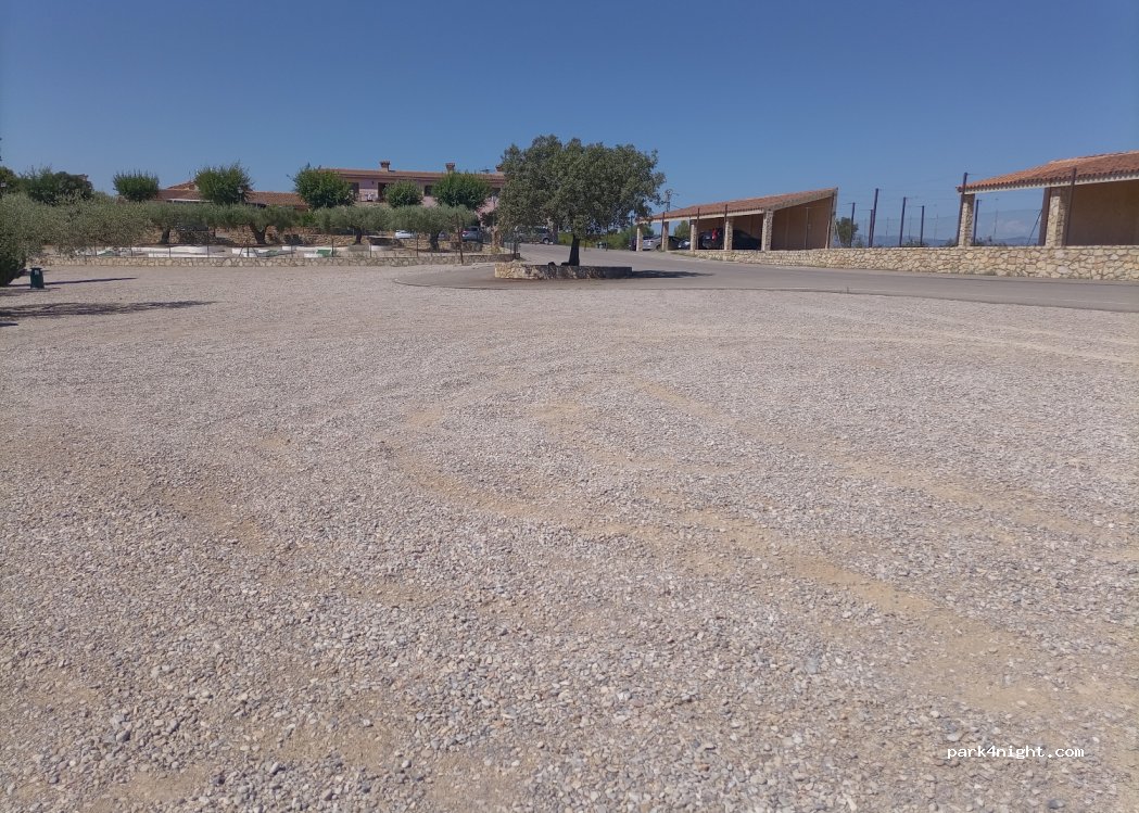 lugar con encanto encima de una loma, tiene bancos y mesas, aseos, fuente y parque infantil. pasamos 2 noches muy tranquilas. hay un hotel restaurante allí mismo.