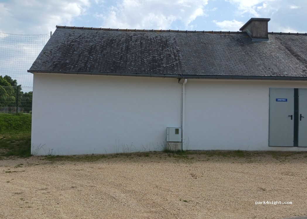 Petit parking à côté du terrain de foot, terrain légèrement accidenté, nuit calme. Il vaut la peine de se promener dans le village, boulangerie et bar sur la place, aire de jeux derrière la mairie.