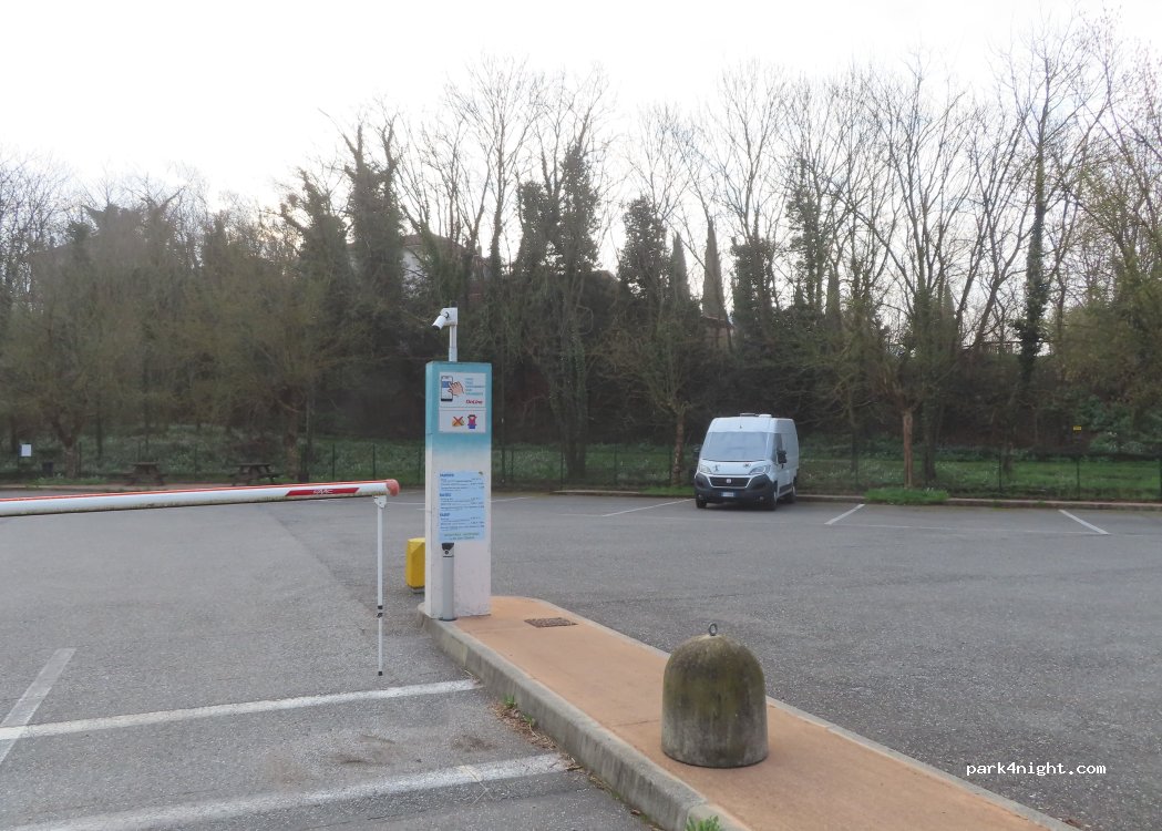 Ampio parcheggio riservato ai camper. Accesso delimitato da sbarra. Tutto automatizzato, seguire istruzioni dettagliate per accesso, carico, scarico e allaccio corrente.
