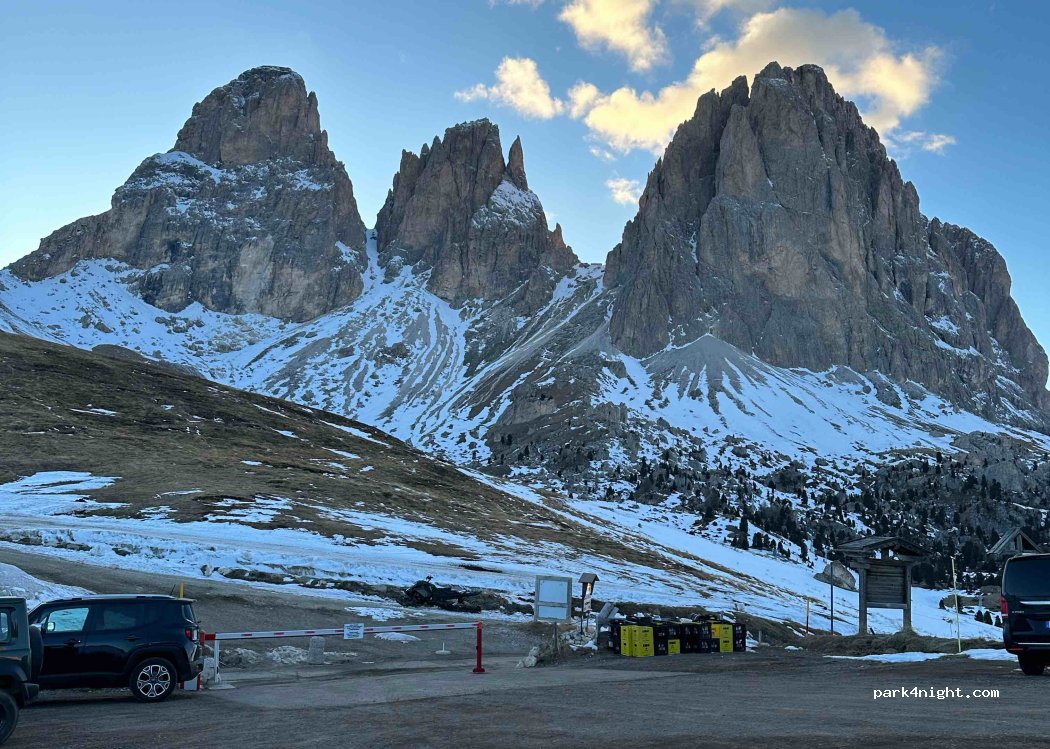A parking space at the top of the pass. Here you stand directly in front of the Sassolungo and have a breathtaking view. There is a barrier in front of the square. Below is the Carlo Valentino house. You can pay for the night there. We will come back for sure