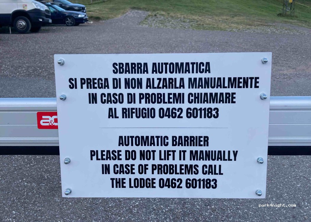 Costo alto per un parcheggio senza servizi.20 euro ore diurne e altre 20 fino mattino successivo. Posto comodissimo per escursioni. Occhio: con camper lungo dalla strada provinciale salire sulla rampa provenendo da Passo Sella, diversamente il camper può toccare sotto al cambio di pendenza!Stessa cosa scendendo:girare a dx verso Passo Sella in ogni caso e fare inversione più su se si deve scendere