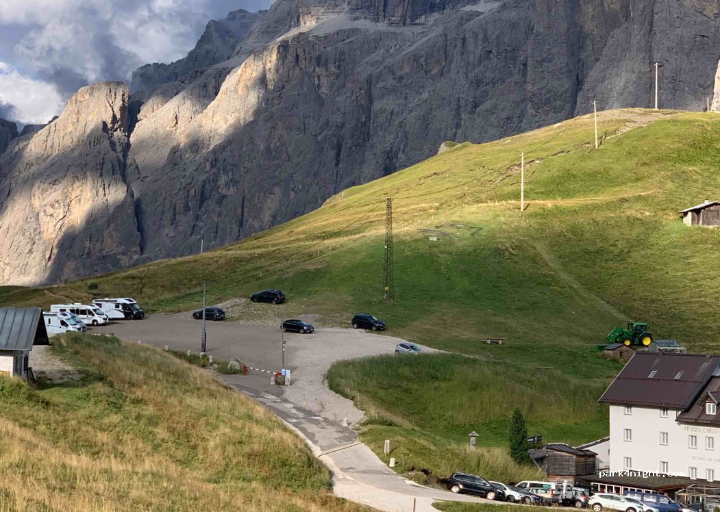 Le parking peut accueillir bien plus que 5 fourgons, au moins une quinzaine. Il faut descendre au refuge juste en dessous pour payer et qu'on vous ouvre la barrière. 20€ la nuit 20€ la journée, idéal pour les randos autour du Sassolungo. Quasi la seule alternative car les autres parkings du col Sella n'acceptent pas les camper