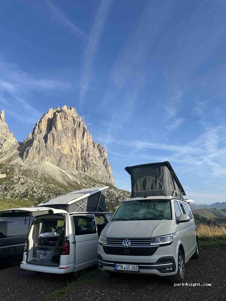 Ein Parkplatz auf der Passhöhe. Hier stehst du direkt vor dem Langkofel und hast eine atemberaubende Aussicht. Vor dem Platz befindet sich eine Schranke. Unten ist das Haus von Carlo Valentino. Dort können Sie die Nacht bezahlen. Wir werden auf jeden Fall wiederkommen