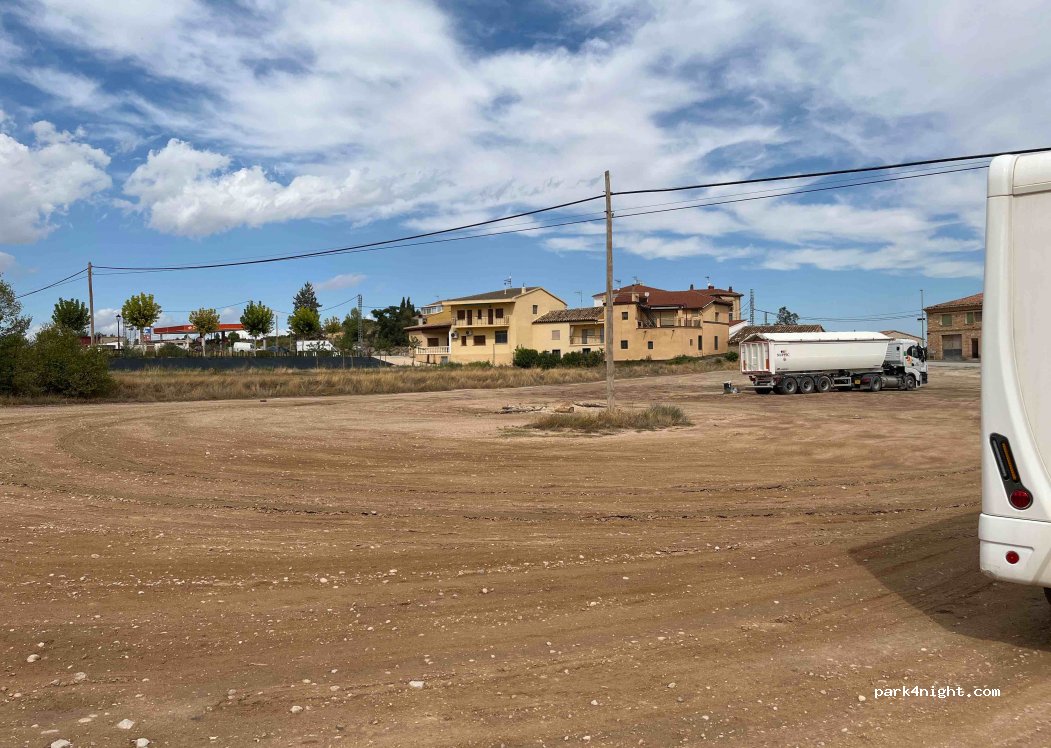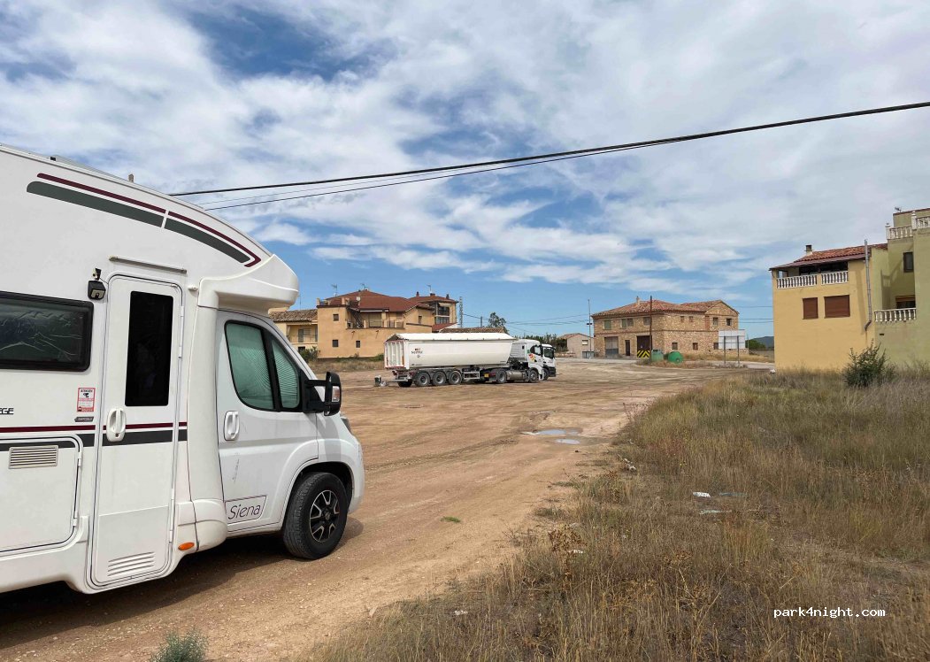 Amplio aparcamiento donde suelen aparcar los camiones a las afueras del pueblo. El pueblo tiene todos los servicios y se puede visitar. No hay sombra.