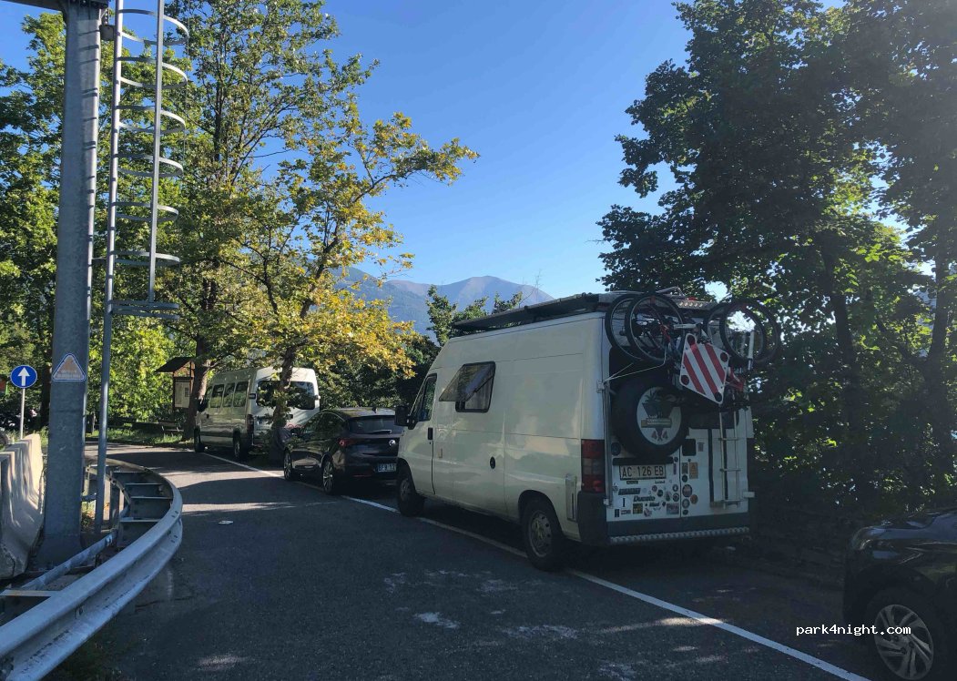 Petite aire de stationnement à côté de la route principale pour environ 4/5 véhicules. La route est assez fréquentée pendant la journée mais calme la nuit. Vues décentes sur le lac et une poubelle fournie !