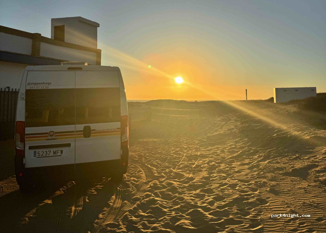 Cerca de la playa, se escucha el mar. Tranquilo y sin peligros. Hemos estado 3 furgoneta pero es muy espacioso, es un aparcamiento de tierra por el día se llena para ir a la playa. Hacia mucho viento pero nos refugiamos entre dos casetas que hay antes del paseo a la playa. Solo que sobre la 2 de la mañana vino un coche de gente joven y se pusieron a nuestro lado y hablaba bastante alto, pero se fueron a los 15 minutos. Recomendable en temporada baja!
