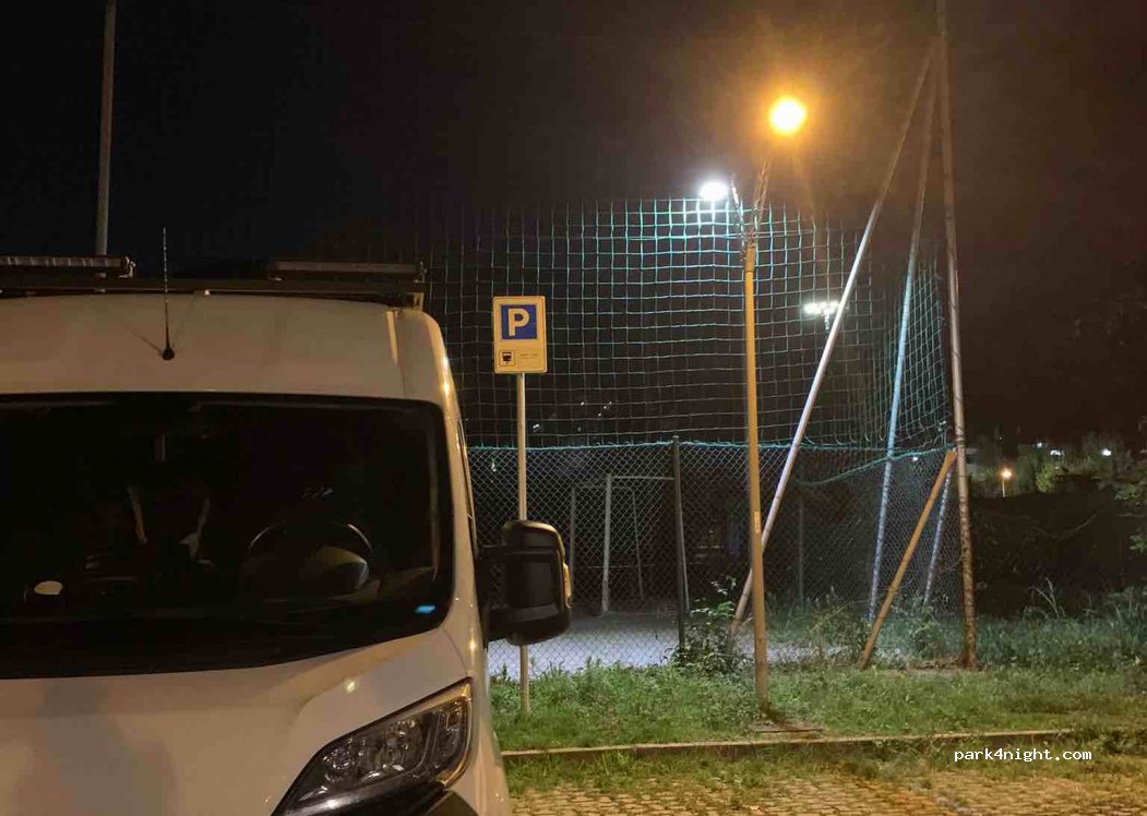 Regular parking spot near a busy street. Around 20 spots. We were woken up by some maintenance work at the neighbouring football pitch. Good bakery in front of the parking which made up for the noisy morning.