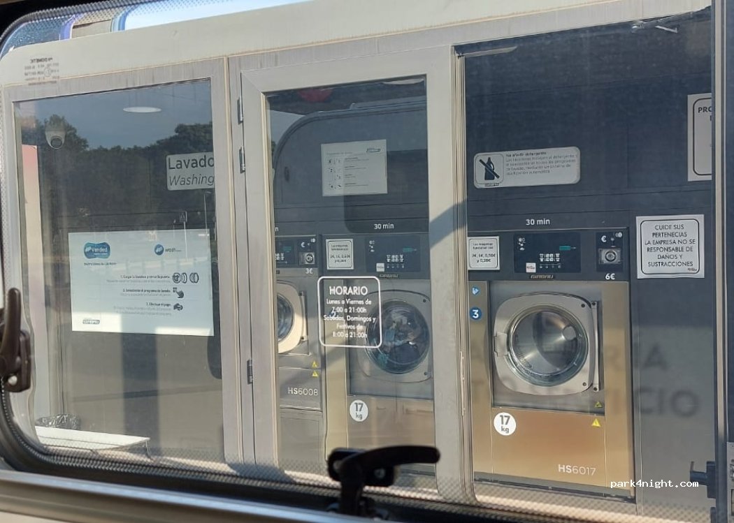 Laundry at Repsol gas station. Easy parking for large vehicles. there is a possibility to fill up watter (no drinking water! 1€/5min)