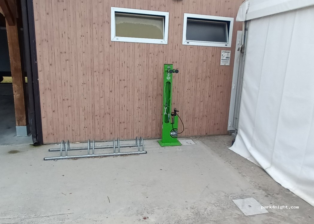 Nice place for a stopover. Water and electricity are working. Playground, football pitch, volleyball pitch are all there. Our dog even found a way to have a dip in the stream next to the parking lot. Restaurants nearby.