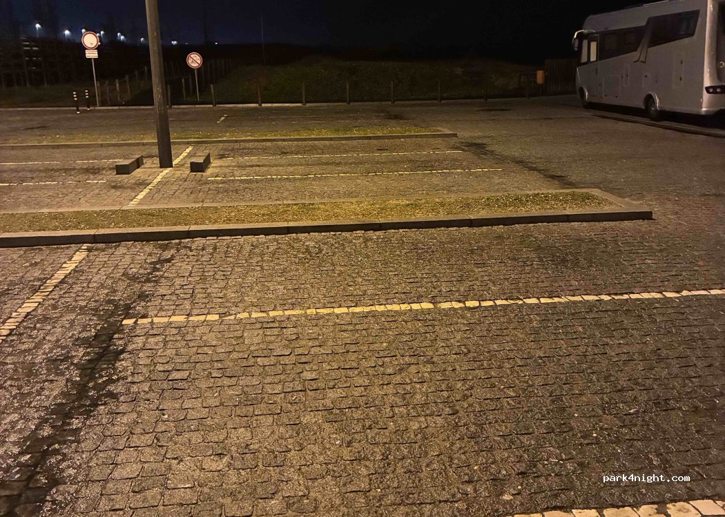 Parking face à la plage, un peu trop minéral et surtout avec une magnifique vue sur la gigantesque raffinerie. Dont le doux murmure des machines, efface celui des vagues suivant le sens du vent.