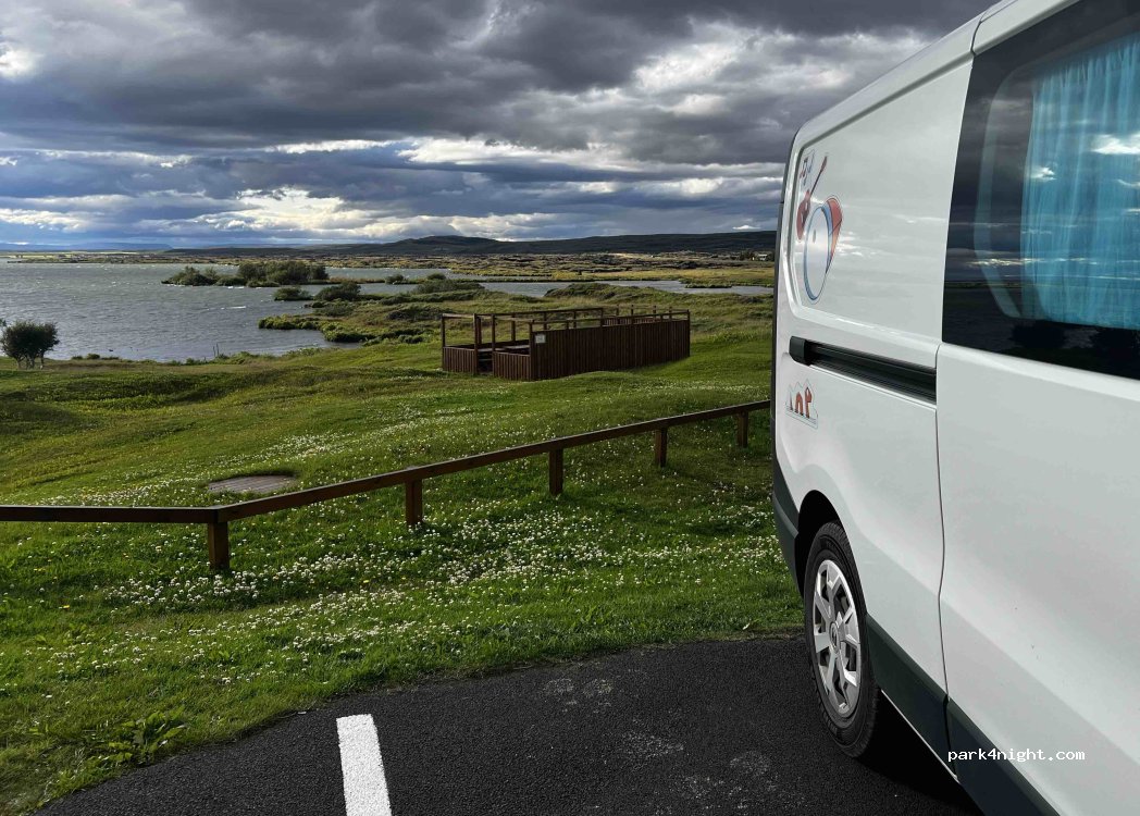 Camping avec vue sur le Lac de Myvatn, site pouvant accueillir des petits vans et quelques uns de plus grands gabarits + camping cars en places limitées, électricité disponible. Un peu cher (2400 ISK/per, douche incluse) mais sûrement dû aux commodités (supérette, station essence en face du camping) et au cadre à proximité directe. Sanitaires propres, eau chaude.