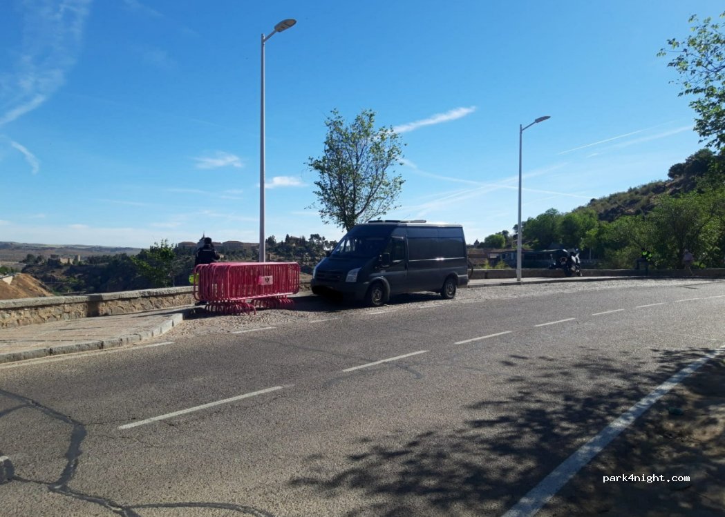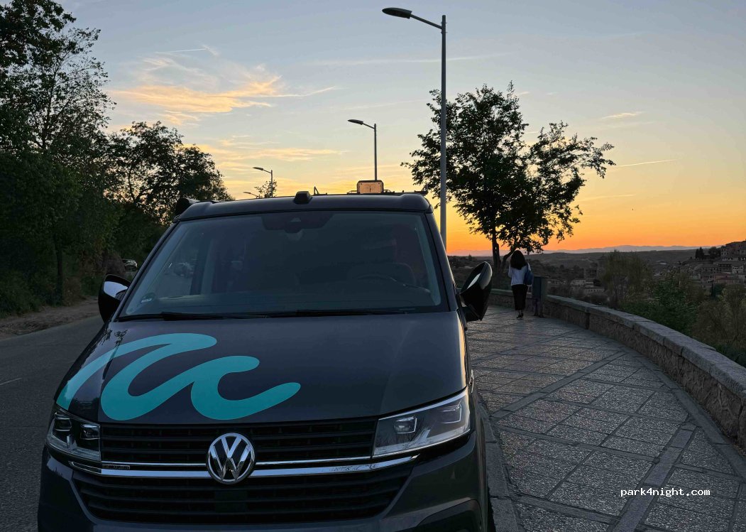 Lo que vi fue aparcamientos de coches que debes ocupar varios para poder estacionar. Carretera muy concurrida incluso con lluvia y la ciudad queda muy lejos andando. Pasaría a ver las preciosas vistas pero elegiría otro lugar para estacionar o pernoctar. La guagua y el bus turístico te llevan a este precioso mirador. Gracias, Toledo.