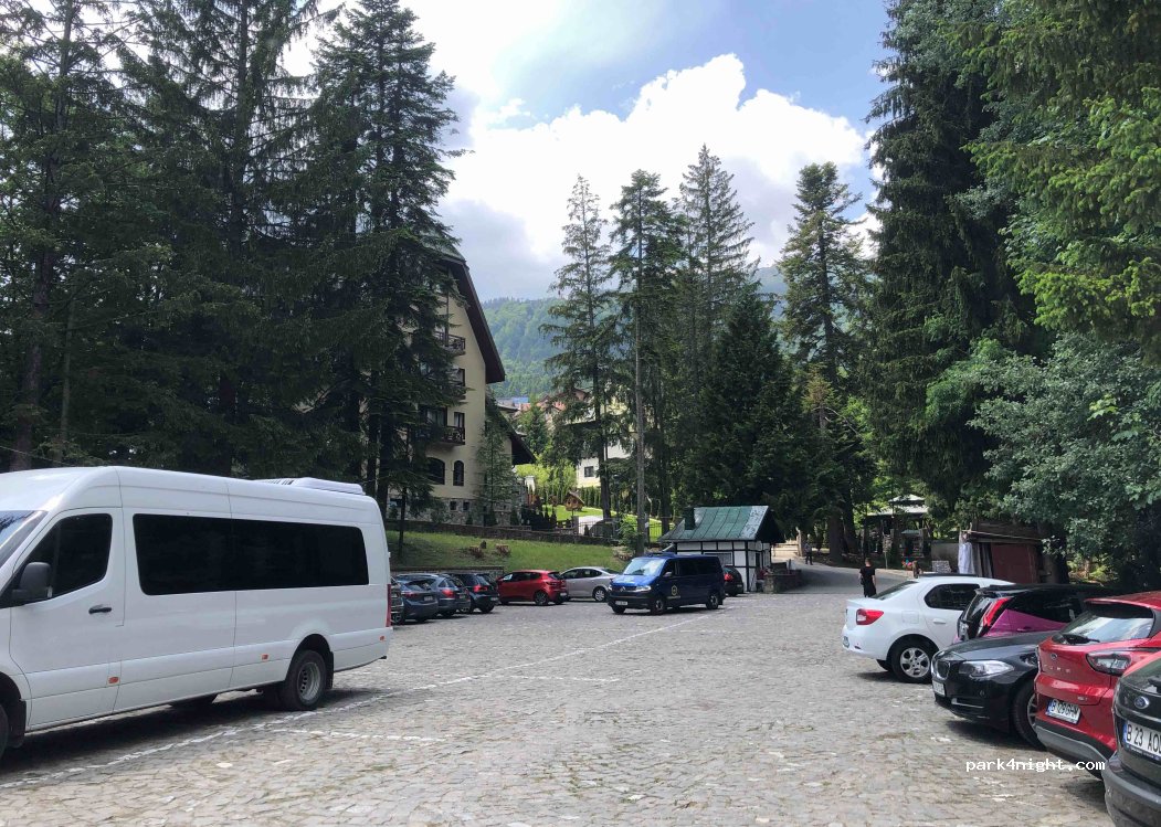 Paid parking, good starting point to visit Peles castle near. Flat, quiet, possible to stay for a night. Many restaurants around.