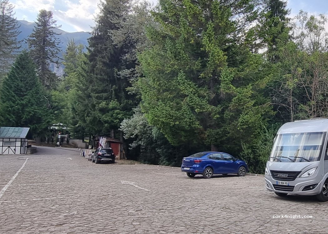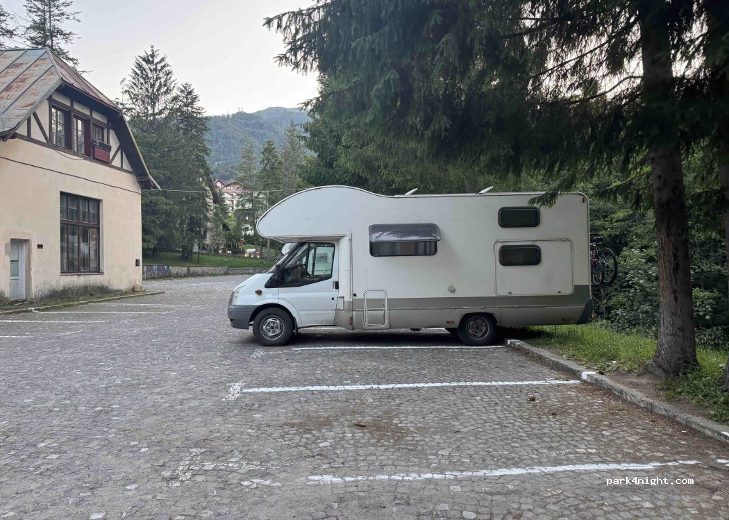Parking accessible à tous les gabarits, sur pavés, partiellement ombragé, globalement de niveau, calme et agréable. Proche du "Castelul Peleș", l'endroit n'est équipé d'aucun service, néanmoins la réception satellite et 4G est optimale. Restaurants à proximité. Stationnement forfaitaire à 10€ ou 60 RON/9h-17h/1 camping-car (17h-09h gratuit) Payer en € plutôt qu'en monnaie locale...