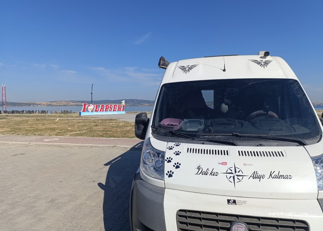 Mooi uitzicht over de Dardanellen en de brug. Zaterdagavond, zachte muziek van het restaurant hiernaast. Een rustige nacht, geen honden gehoord. Vlakke plek.