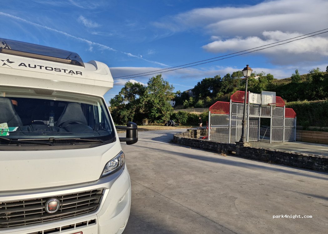A quiet car park in a friendly village. I spent a quiet night here and felt safe. There is a pizza oven that you can use and a basketball court. The place is also easy to reach for larger mobile homes.